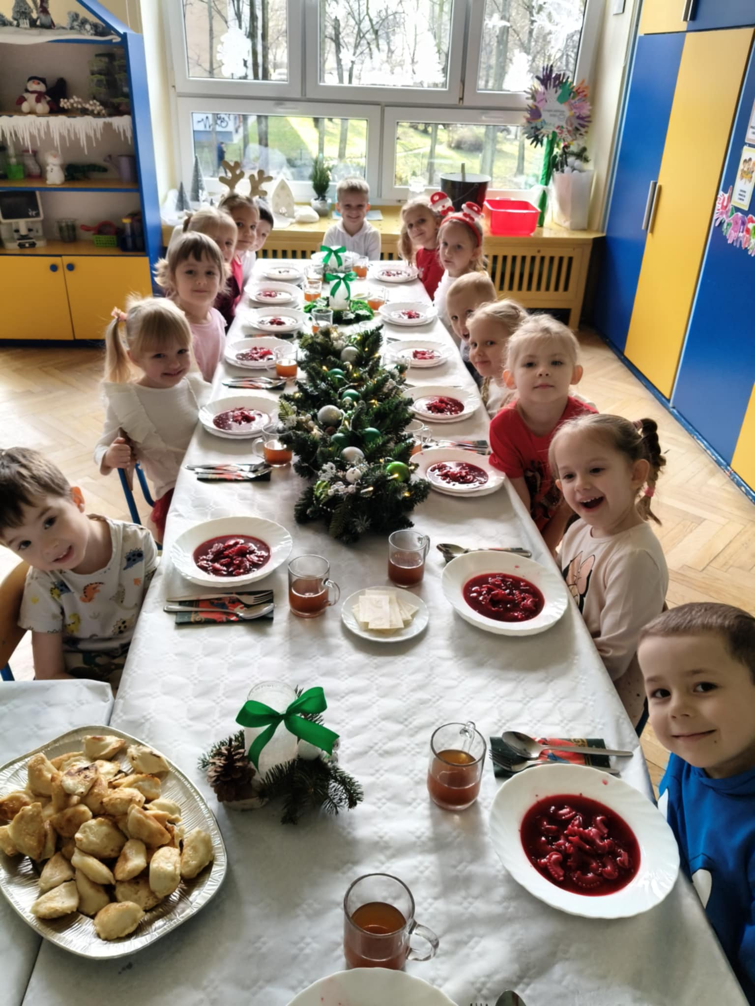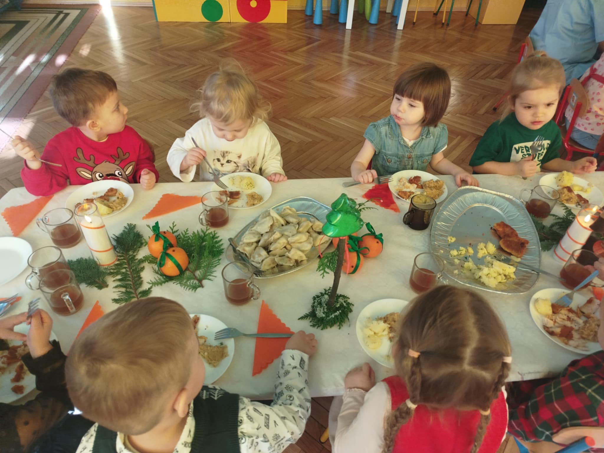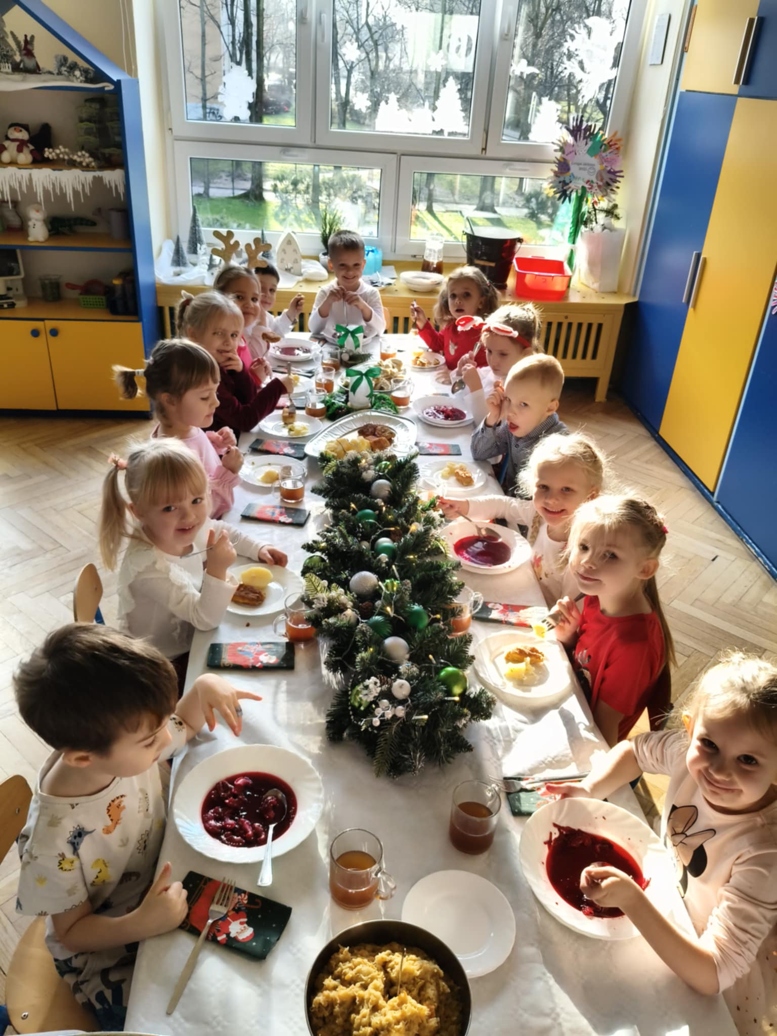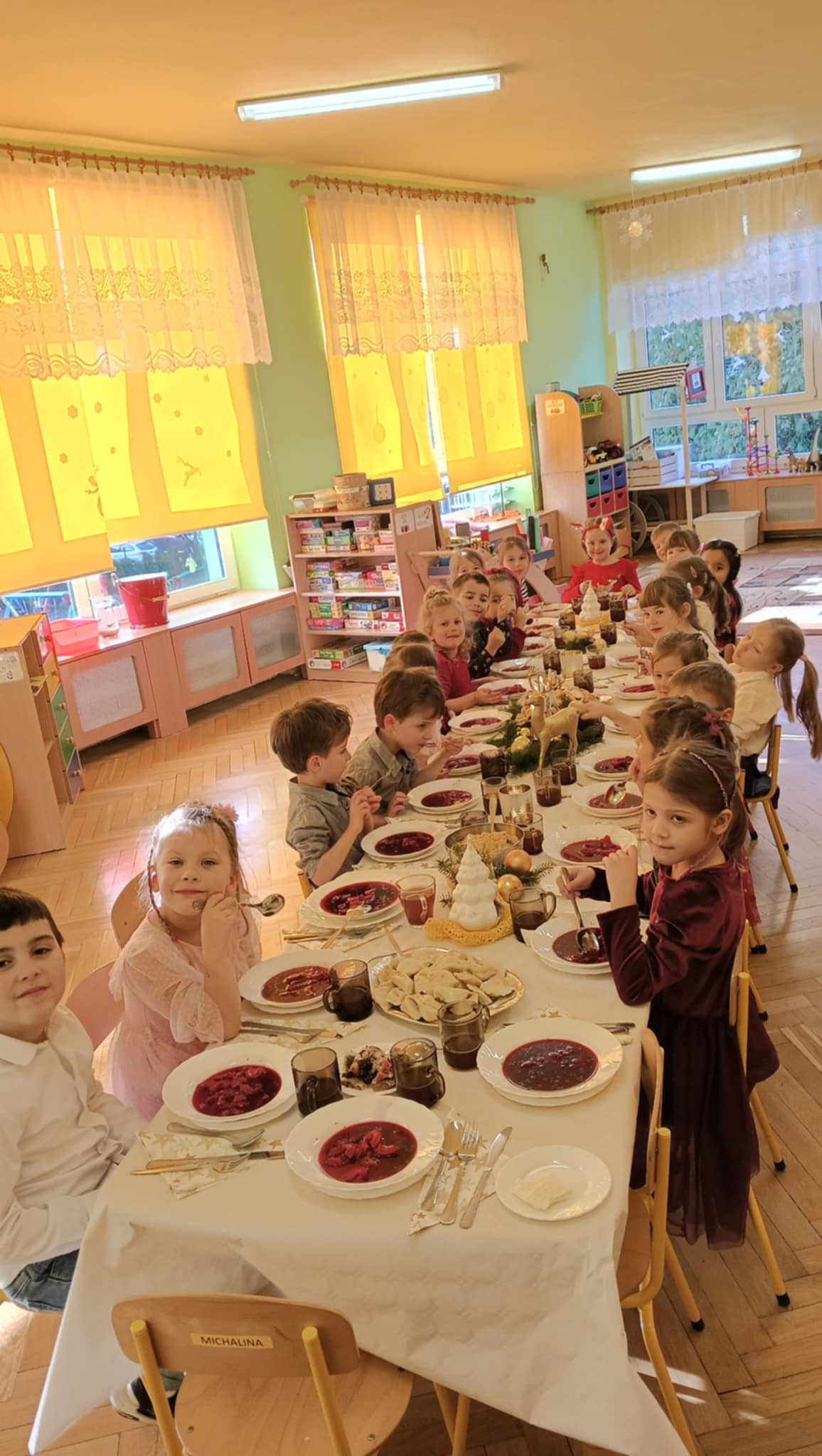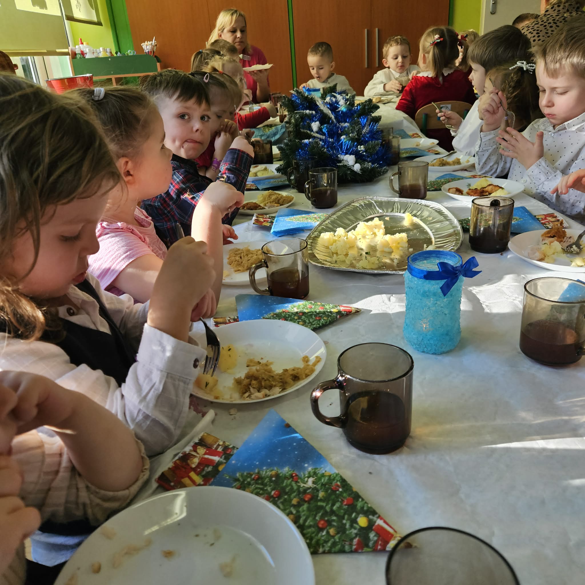 Jak co roku w świątecznej atmosferze przedszkolaki i nauczyciele zasiedli wspólnie do świątecznego obiadu. Towarzyszył nam przy tym przepięknym wystrój stołów i sal, wspólne kolędowanie oraz świąteczne potrawy.
