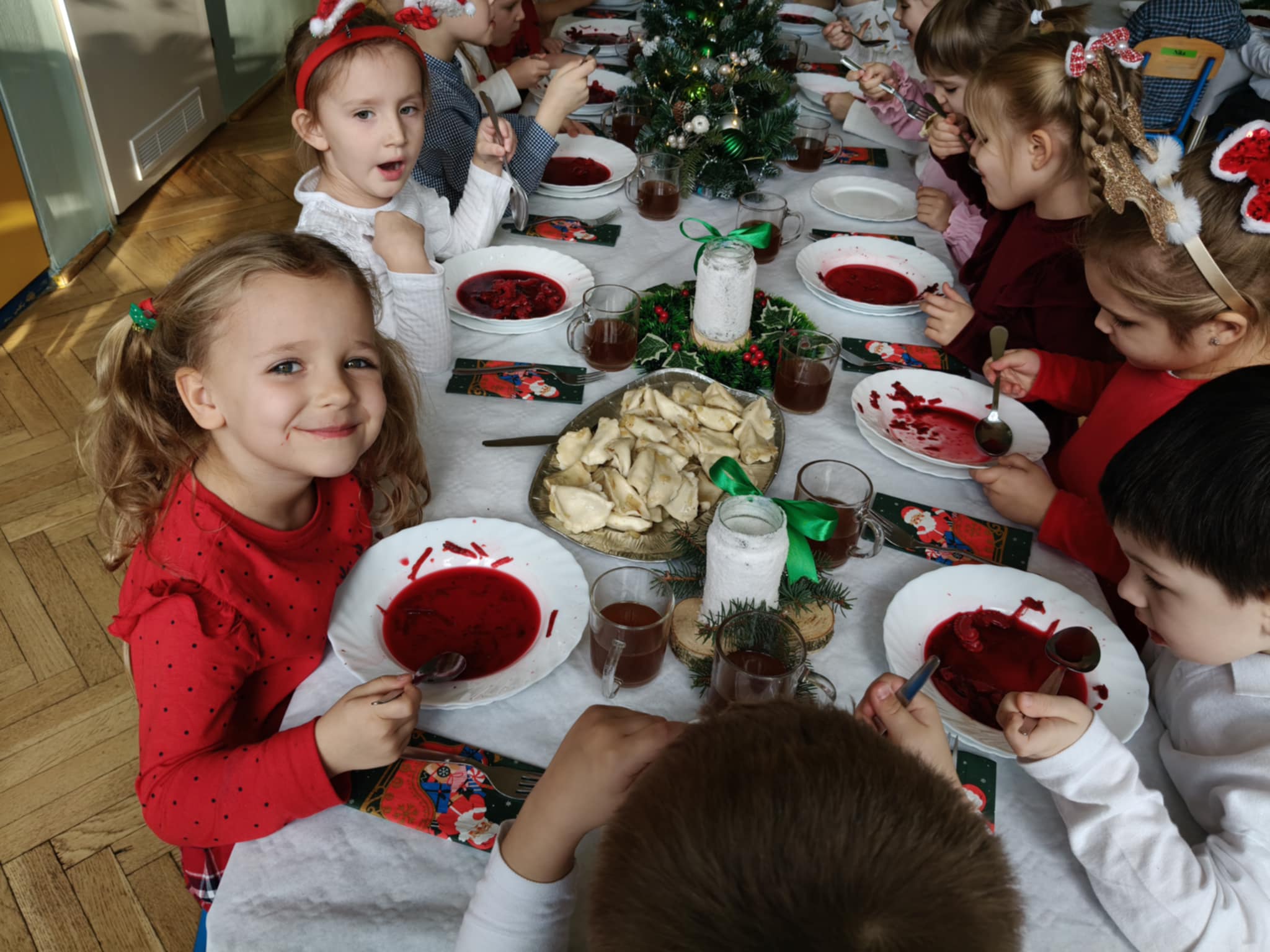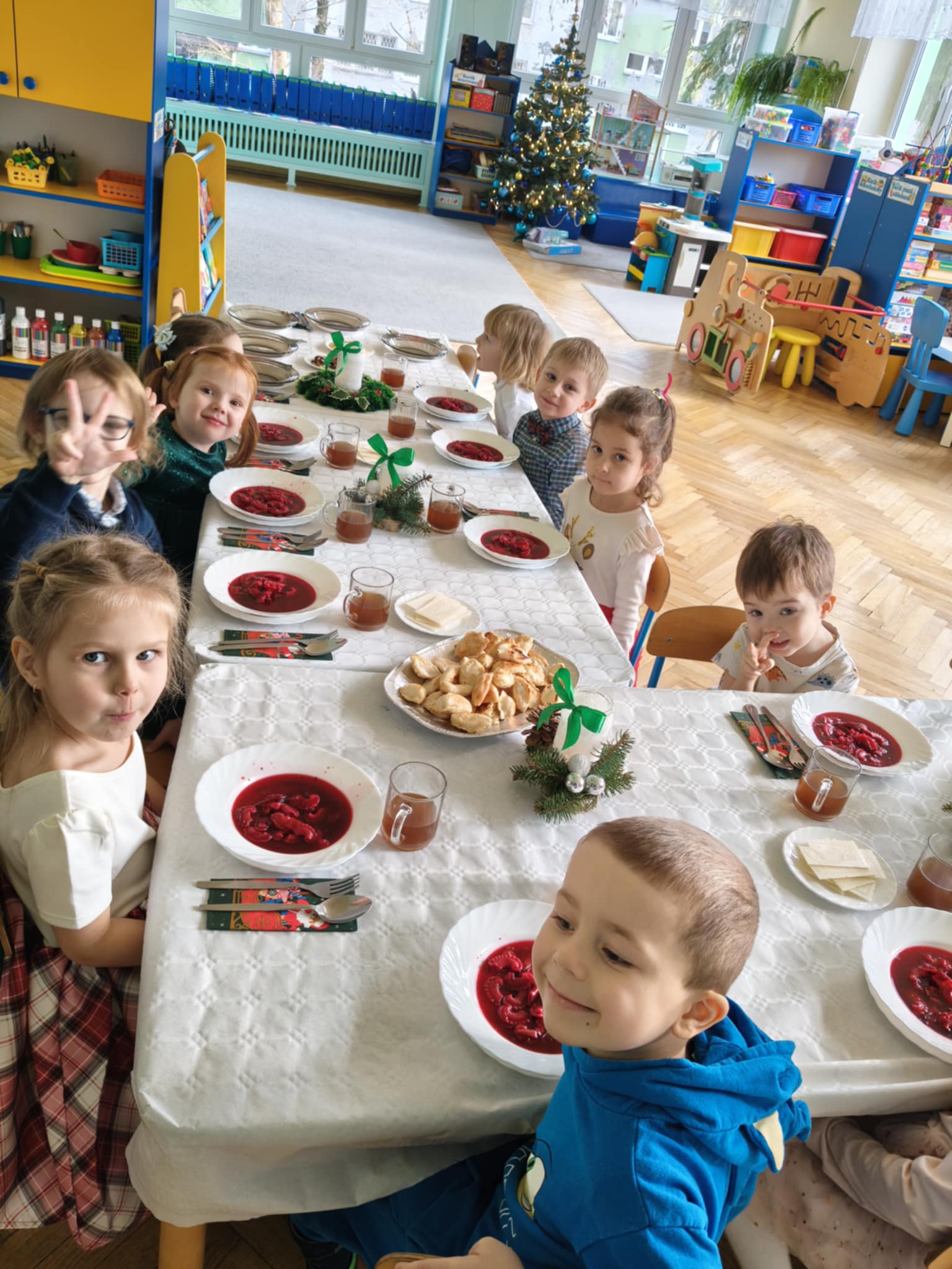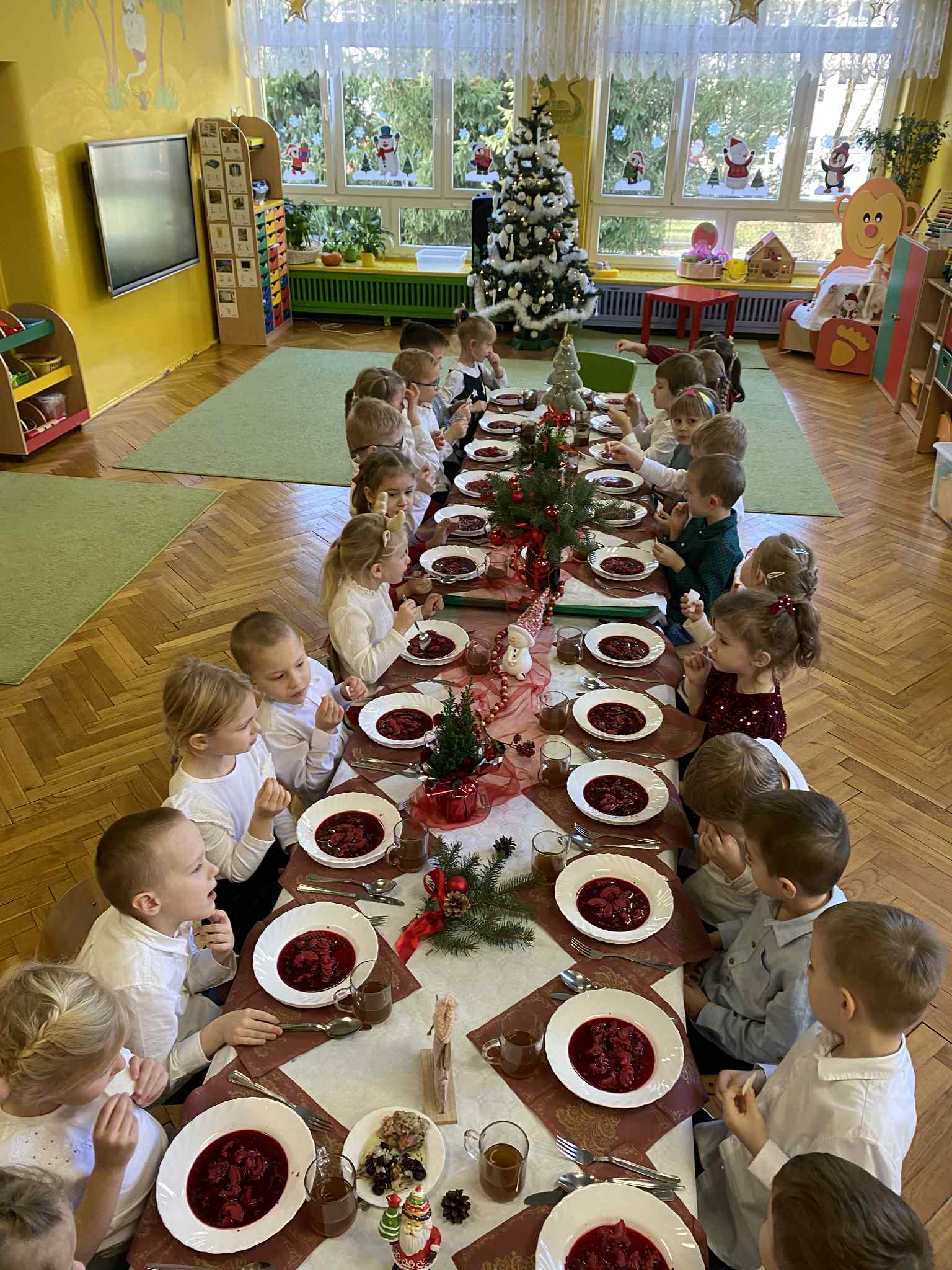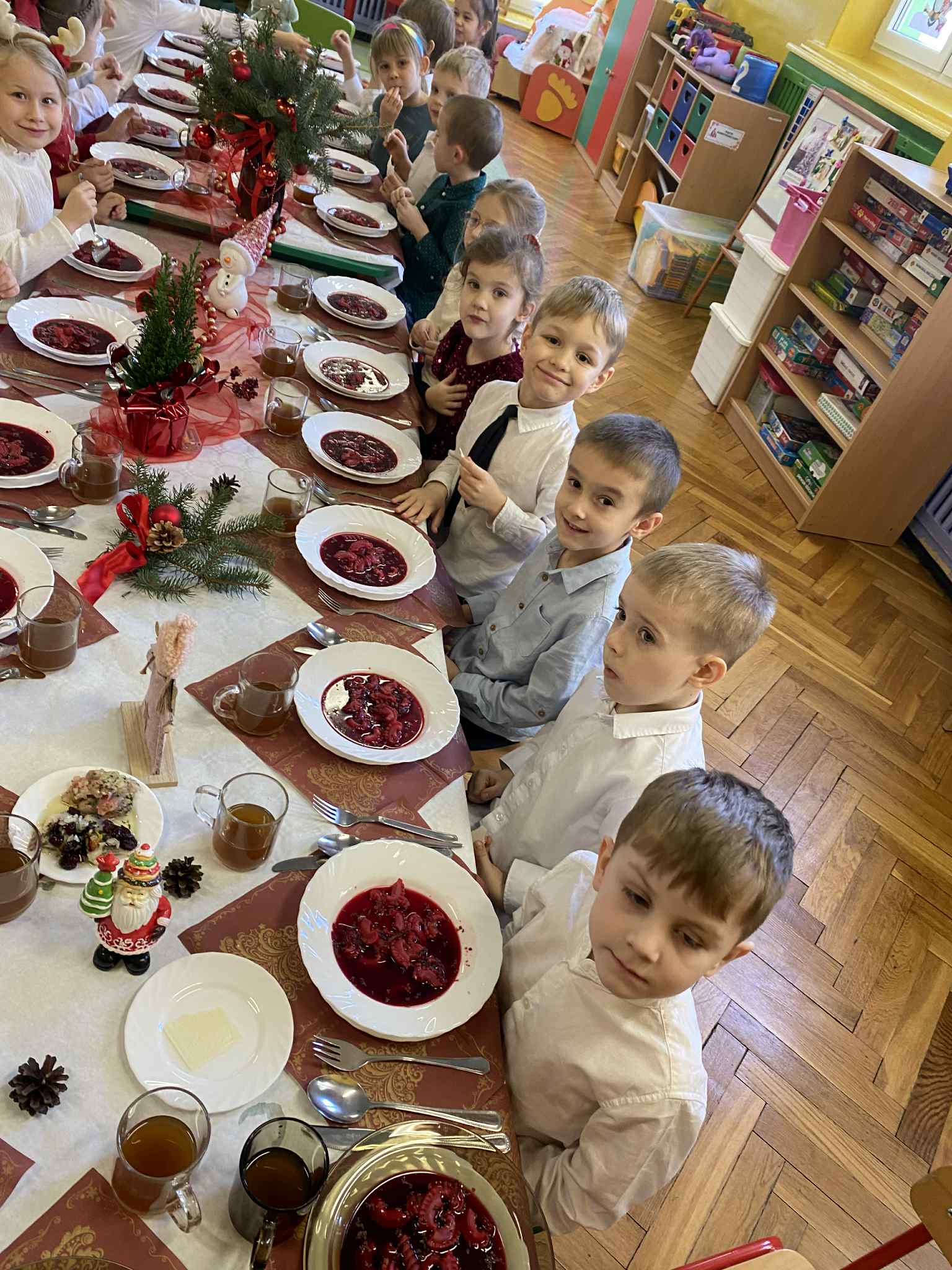 Jak co roku w świątecznej atmosferze przedszkolaki i nauczyciele zasiedli wspólnie do świątecznego obiadu. Towarzyszył nam przy tym przepięknym wystrój stołów i sal, wspólne kolędowanie oraz świąteczne potrawy.