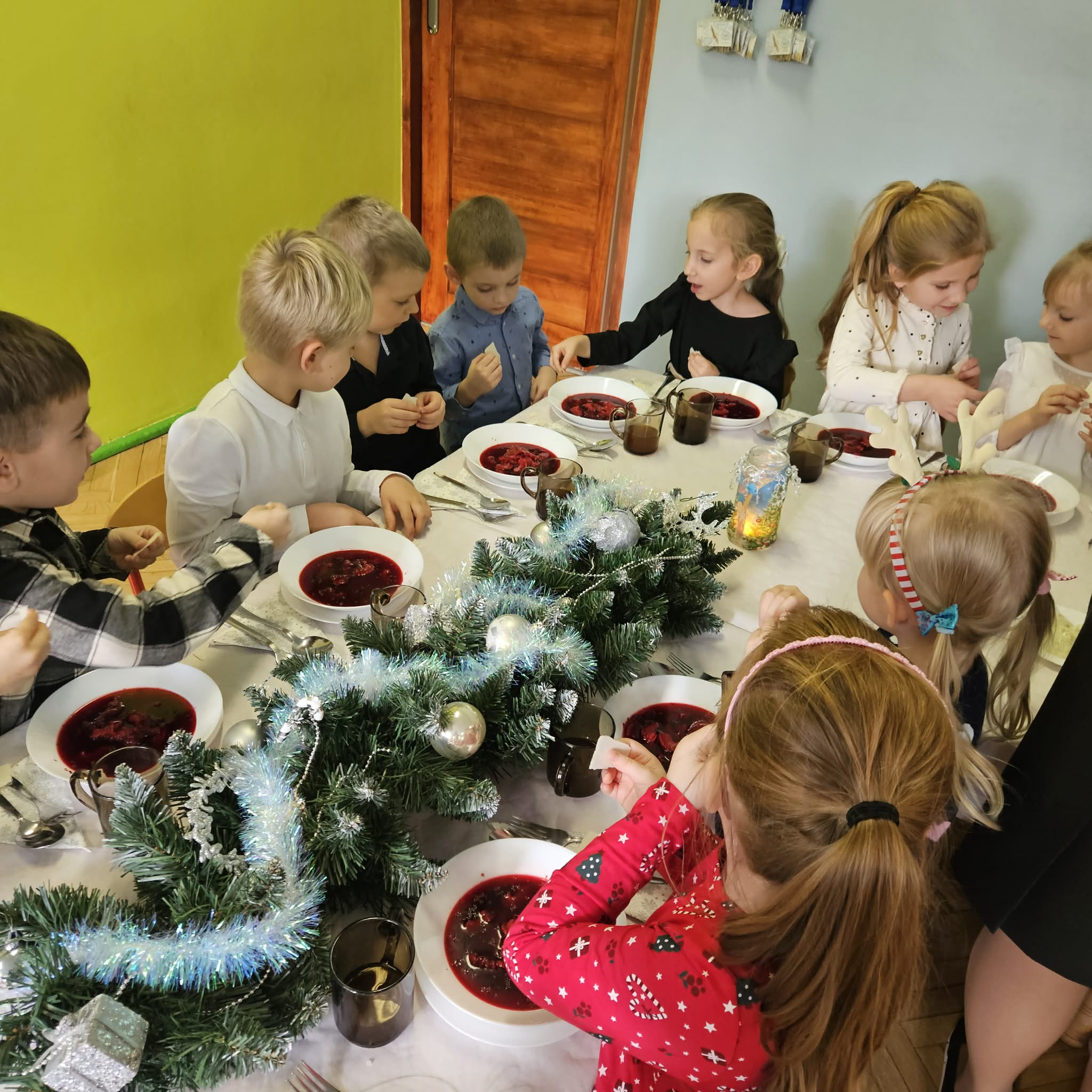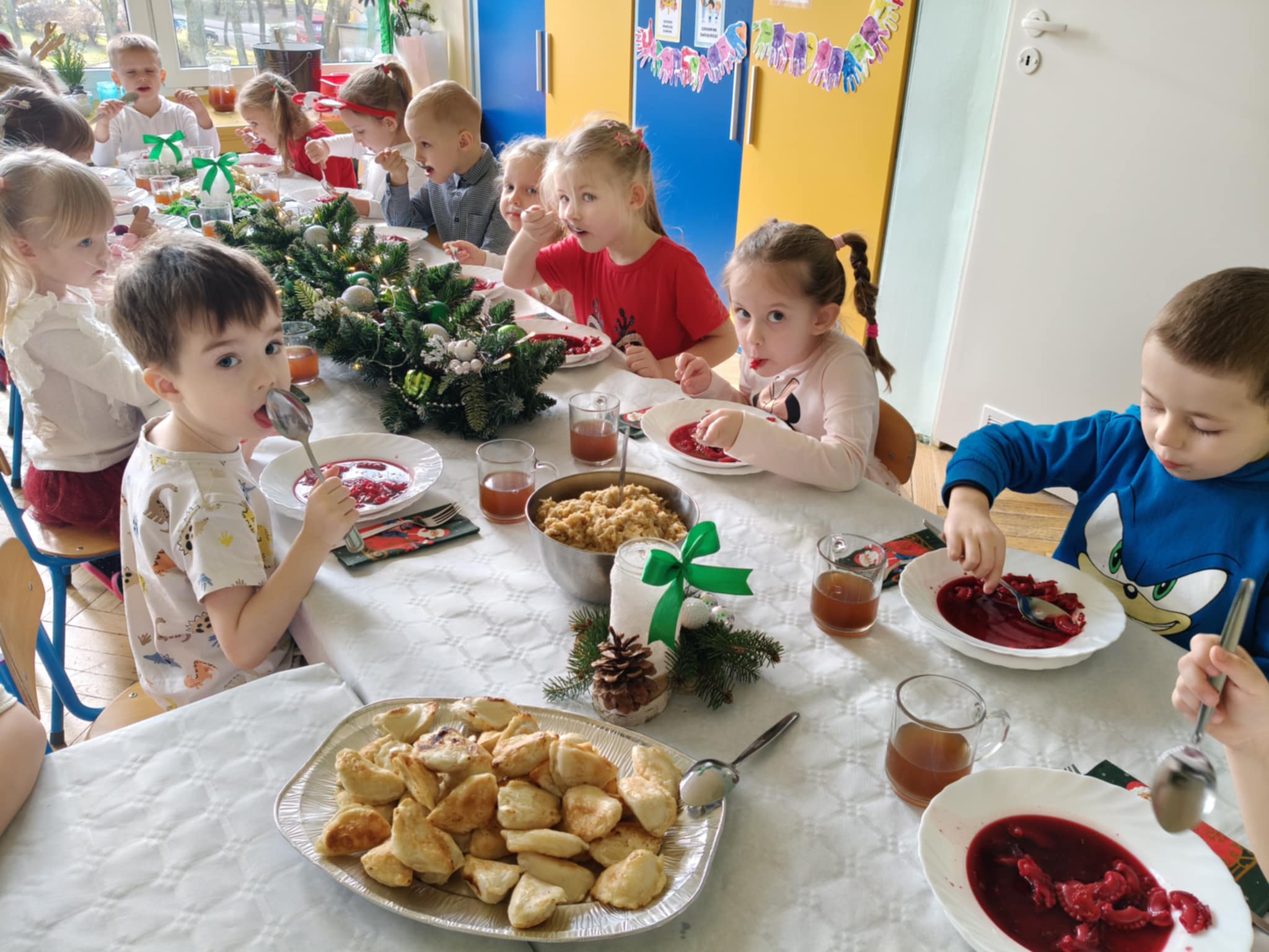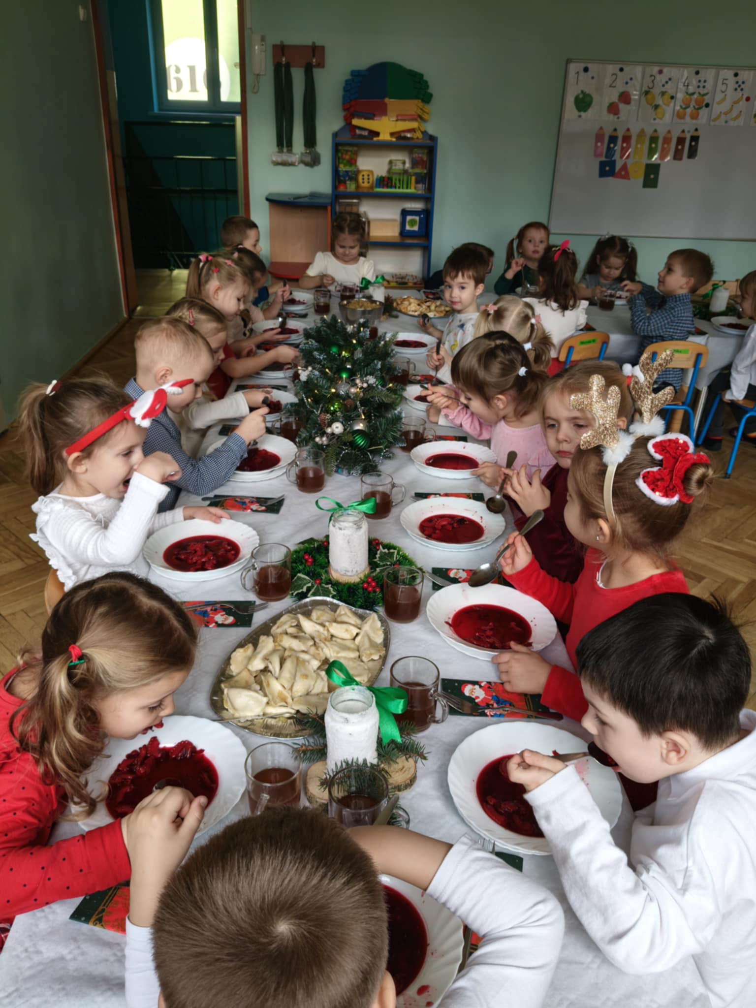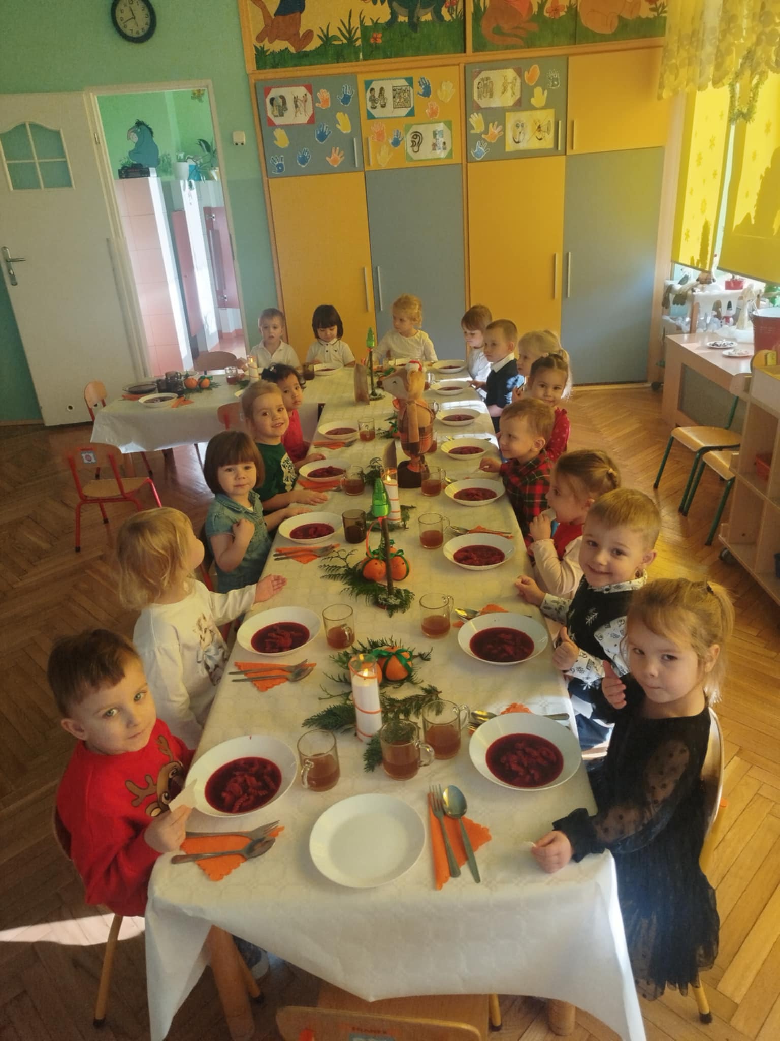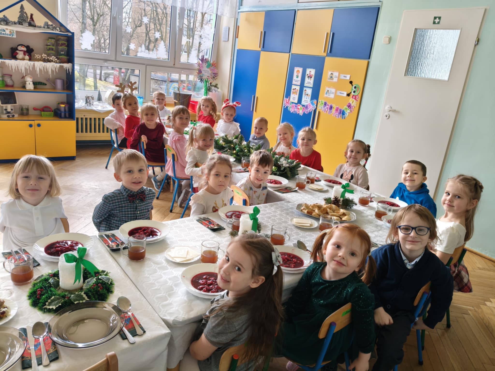 Jak co roku w świątecznej atmosferze przedszkolaki i nauczyciele zasiedli wspólnie do świątecznego obiadu. Towarzyszył nam przy tym przepięknym wystrój stołów i sal, wspólne kolędowanie oraz świąteczne potrawy.