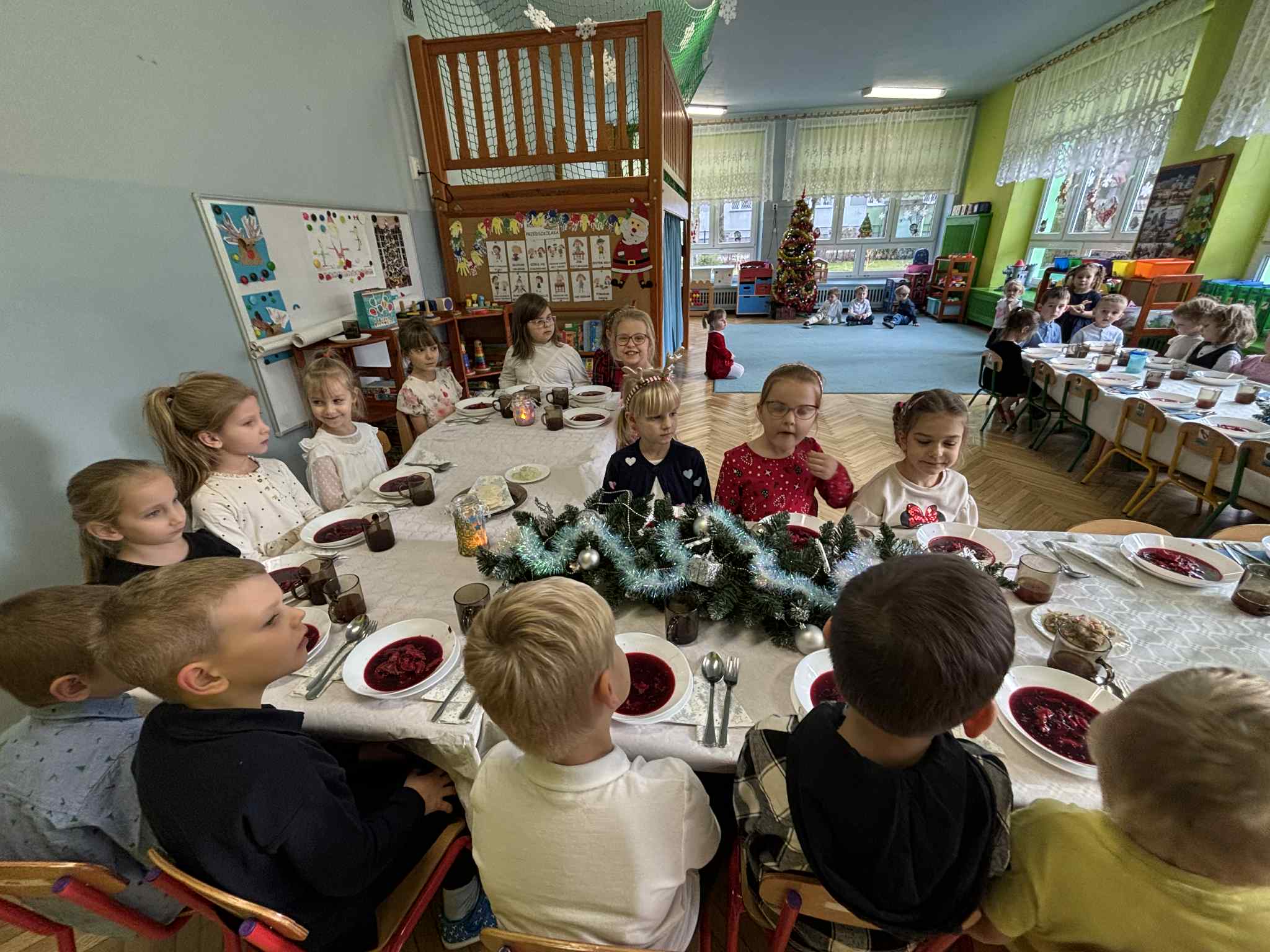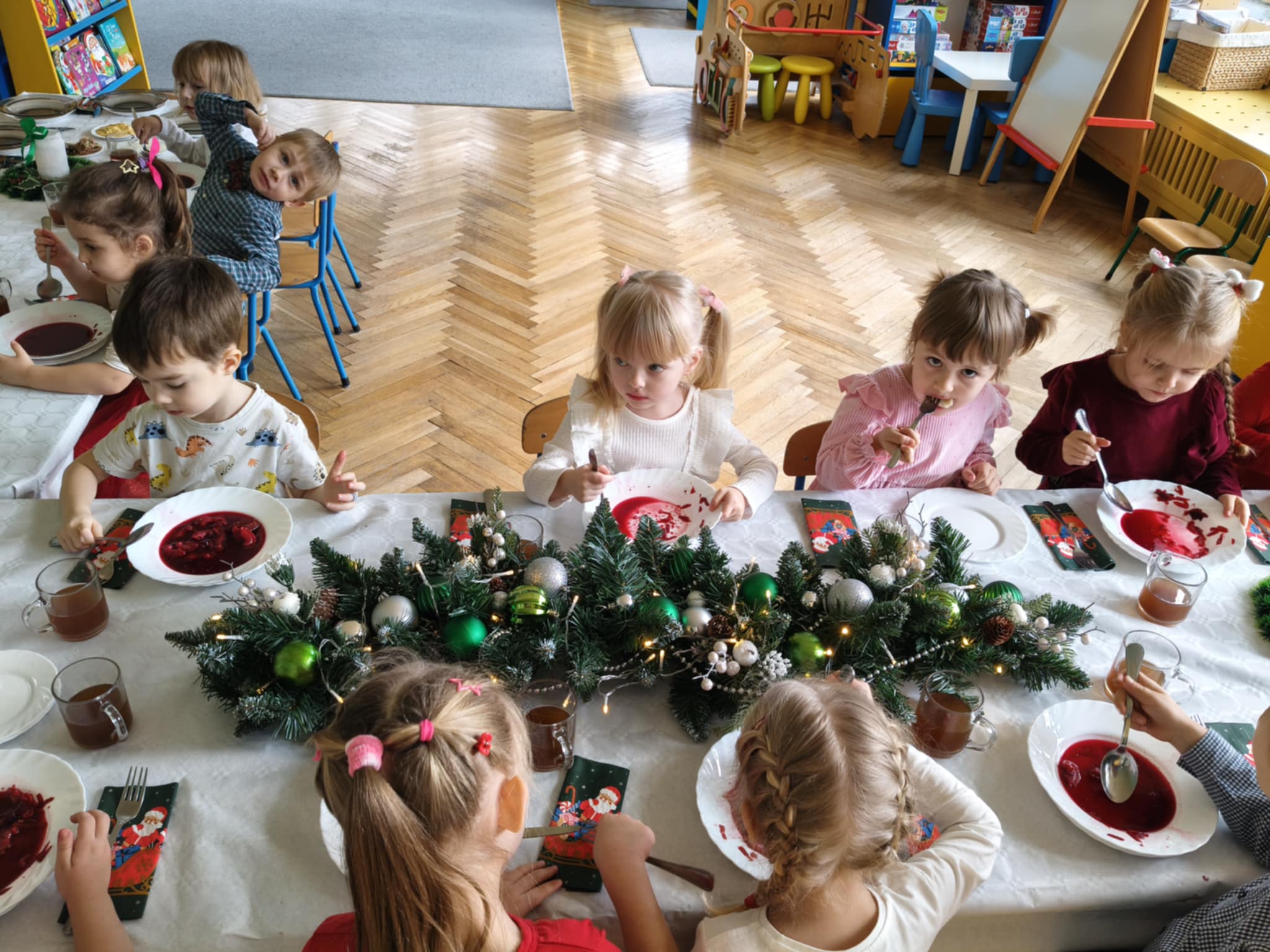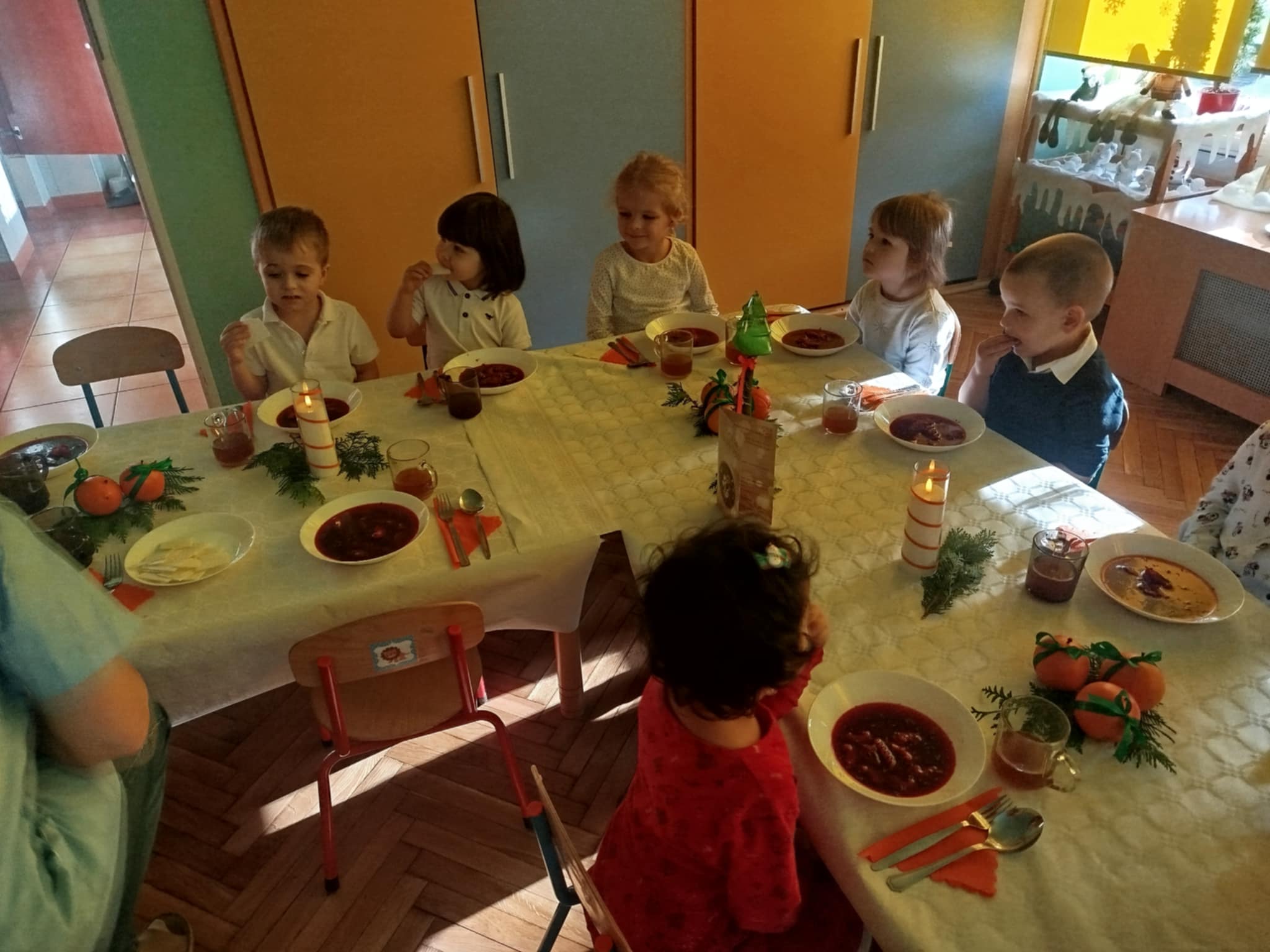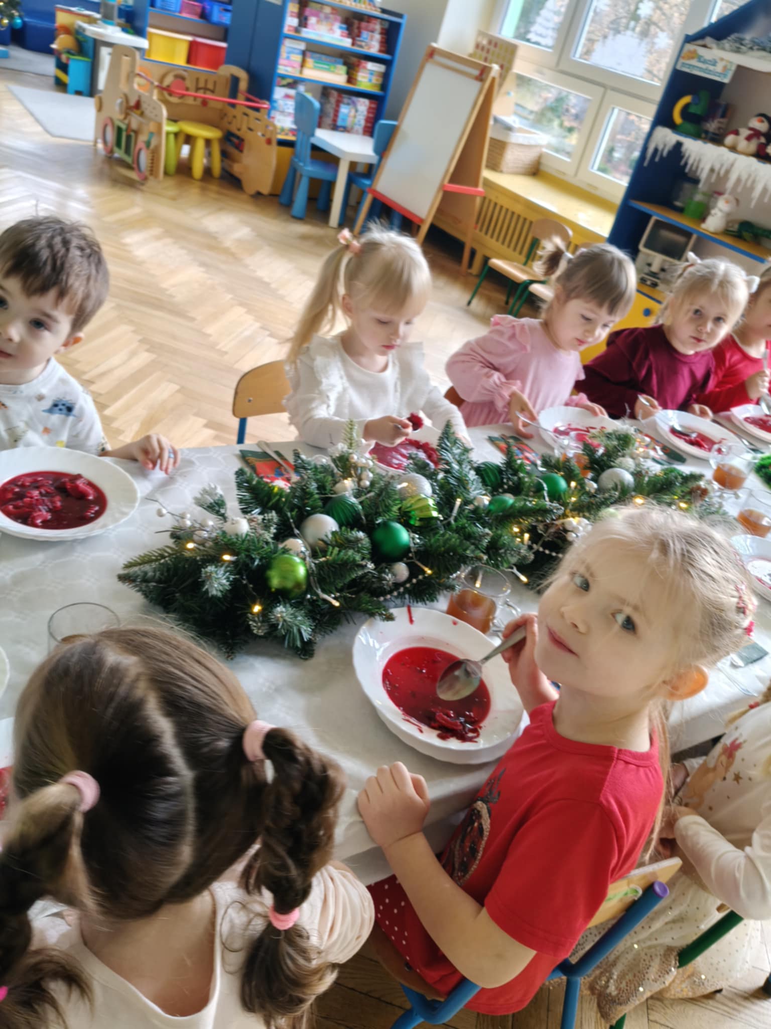 Jak co roku w świątecznej atmosferze przedszkolaki i nauczyciele zasiedli wspólnie do świątecznego obiadu. Towarzyszył nam przy tym przepięknym wystrój stołów i sal, wspólne kolędowanie oraz świąteczne potrawy.