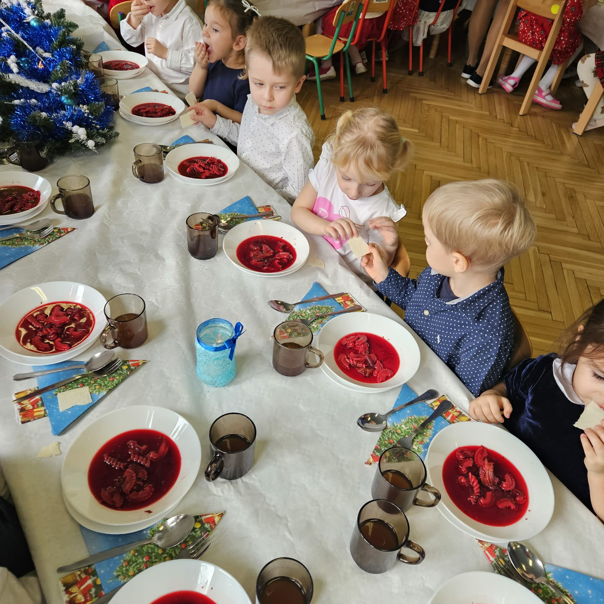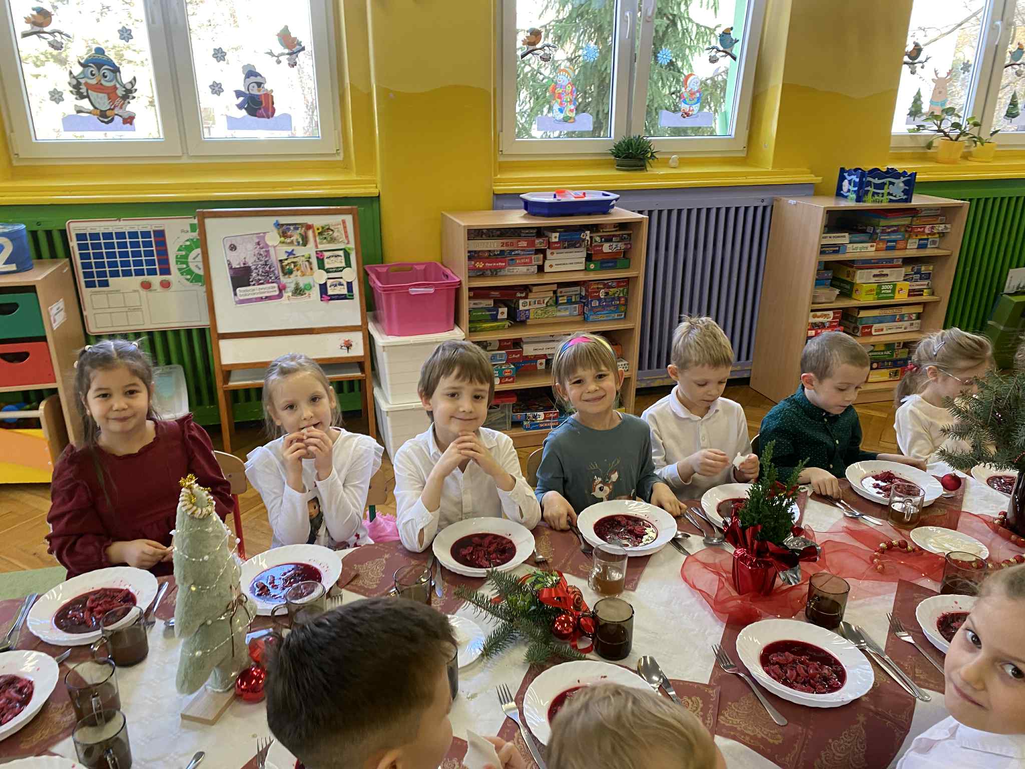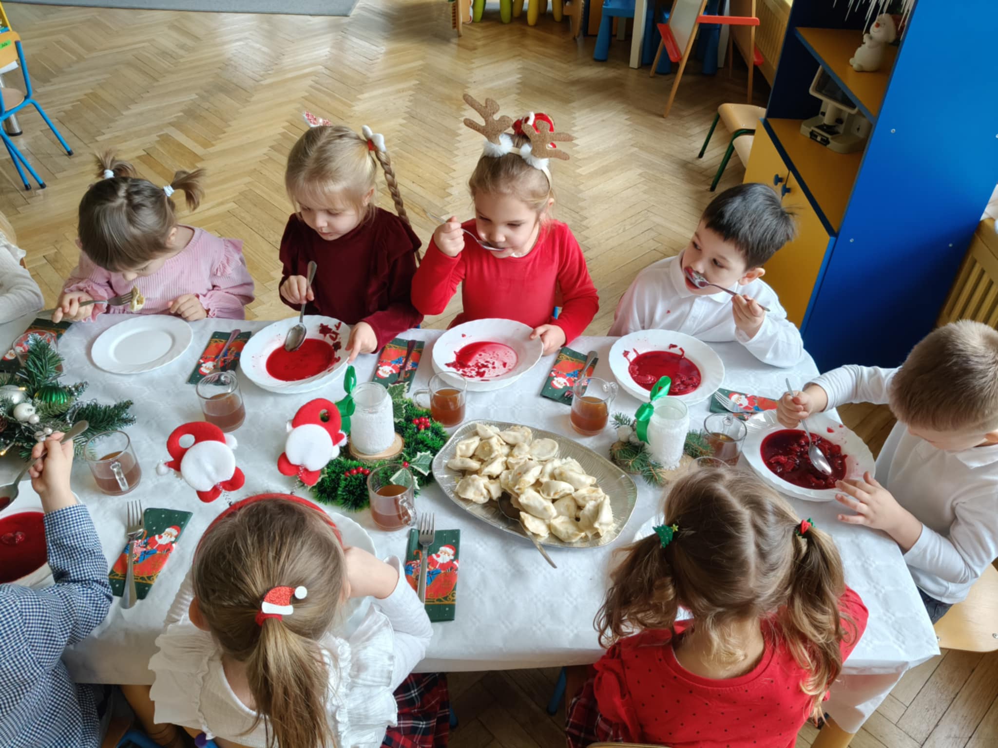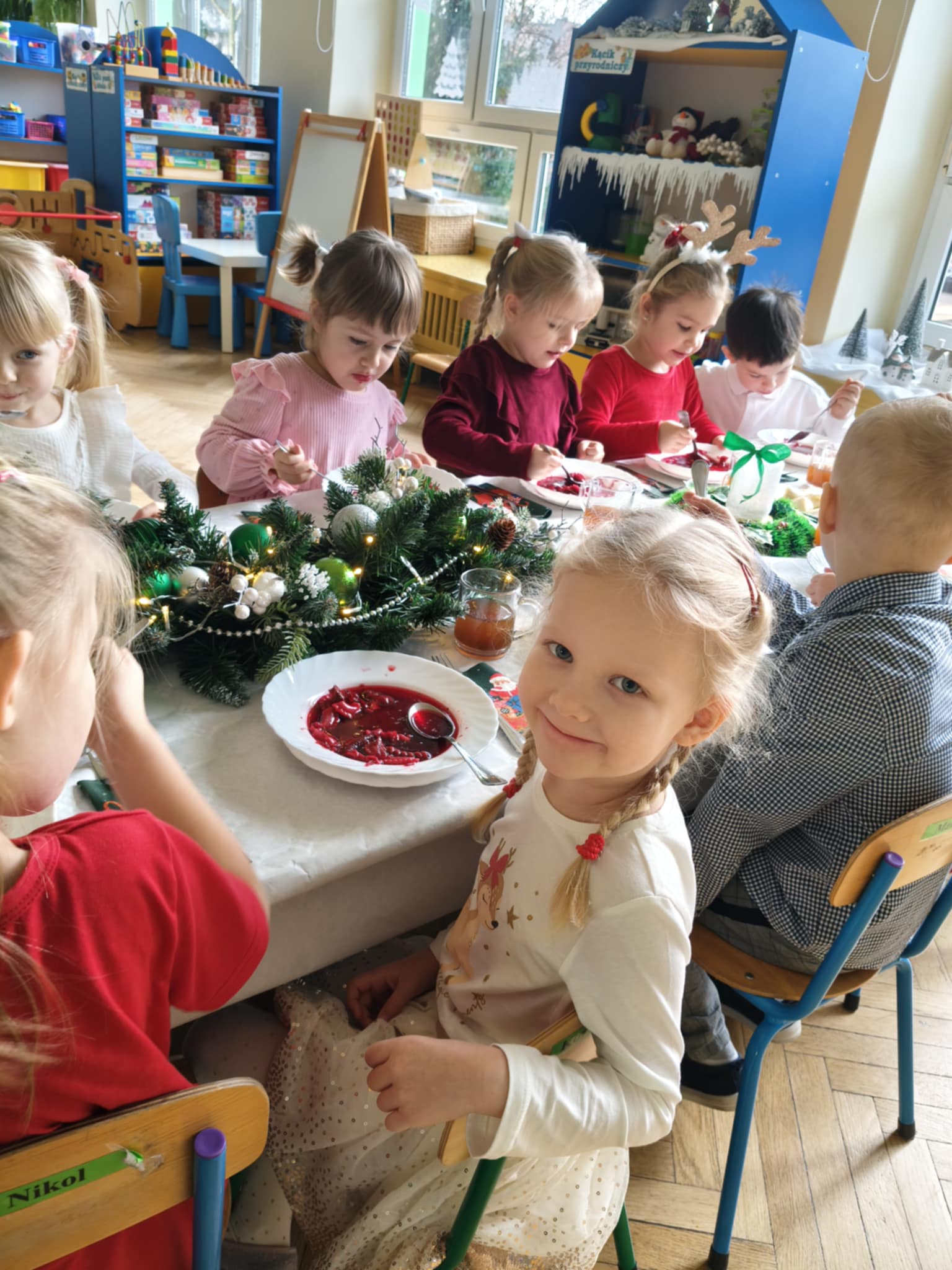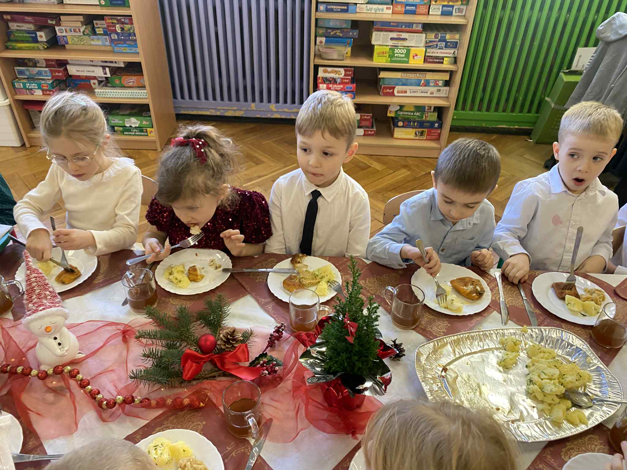 Jak co roku w świątecznej atmosferze przedszkolaki i nauczyciele zasiedli wspólnie do świątecznego obiadu. Towarzyszył nam przy tym przepięknym wystrój stołów i sal, wspólne kolędowanie oraz świąteczne potrawy.