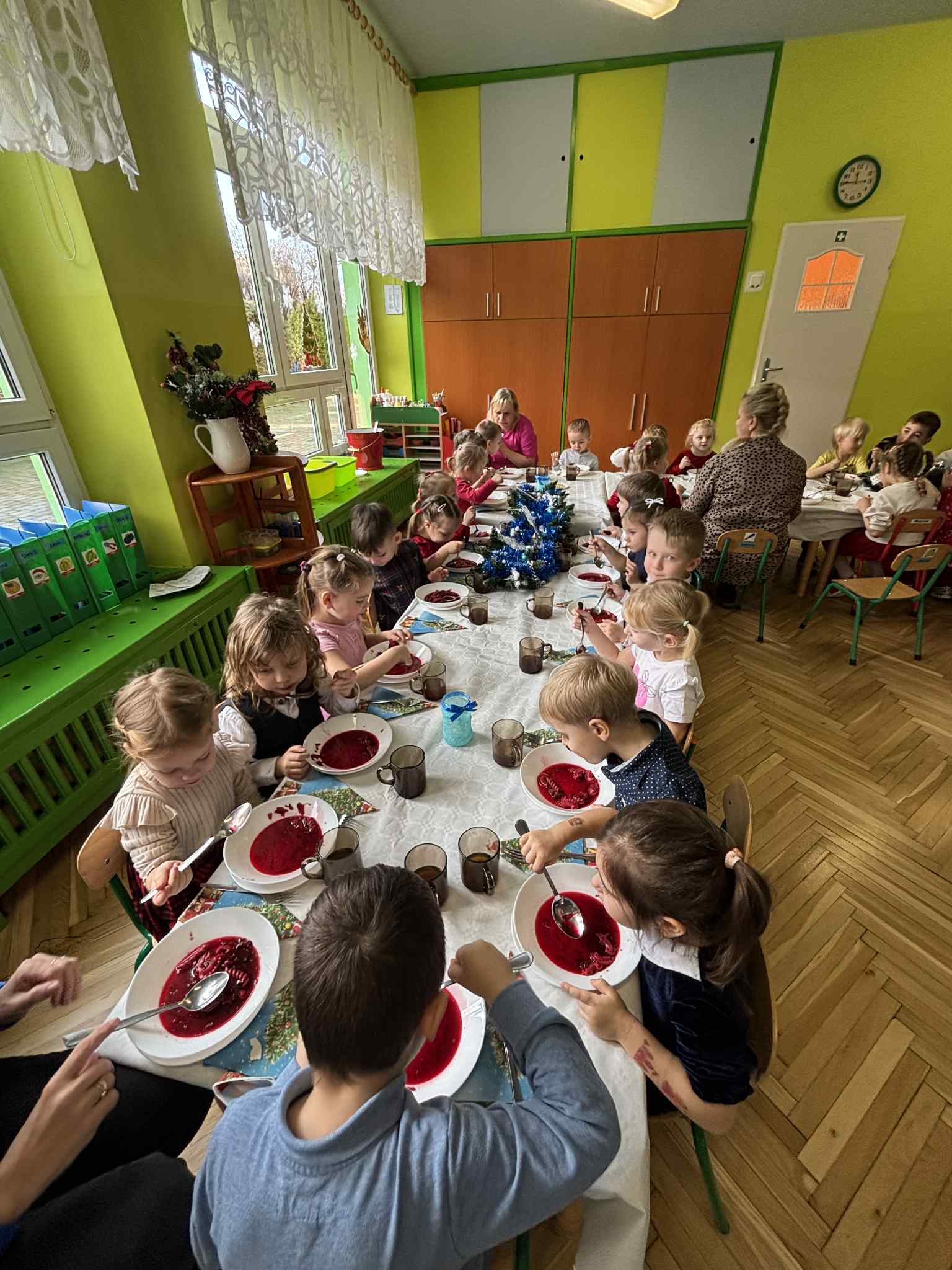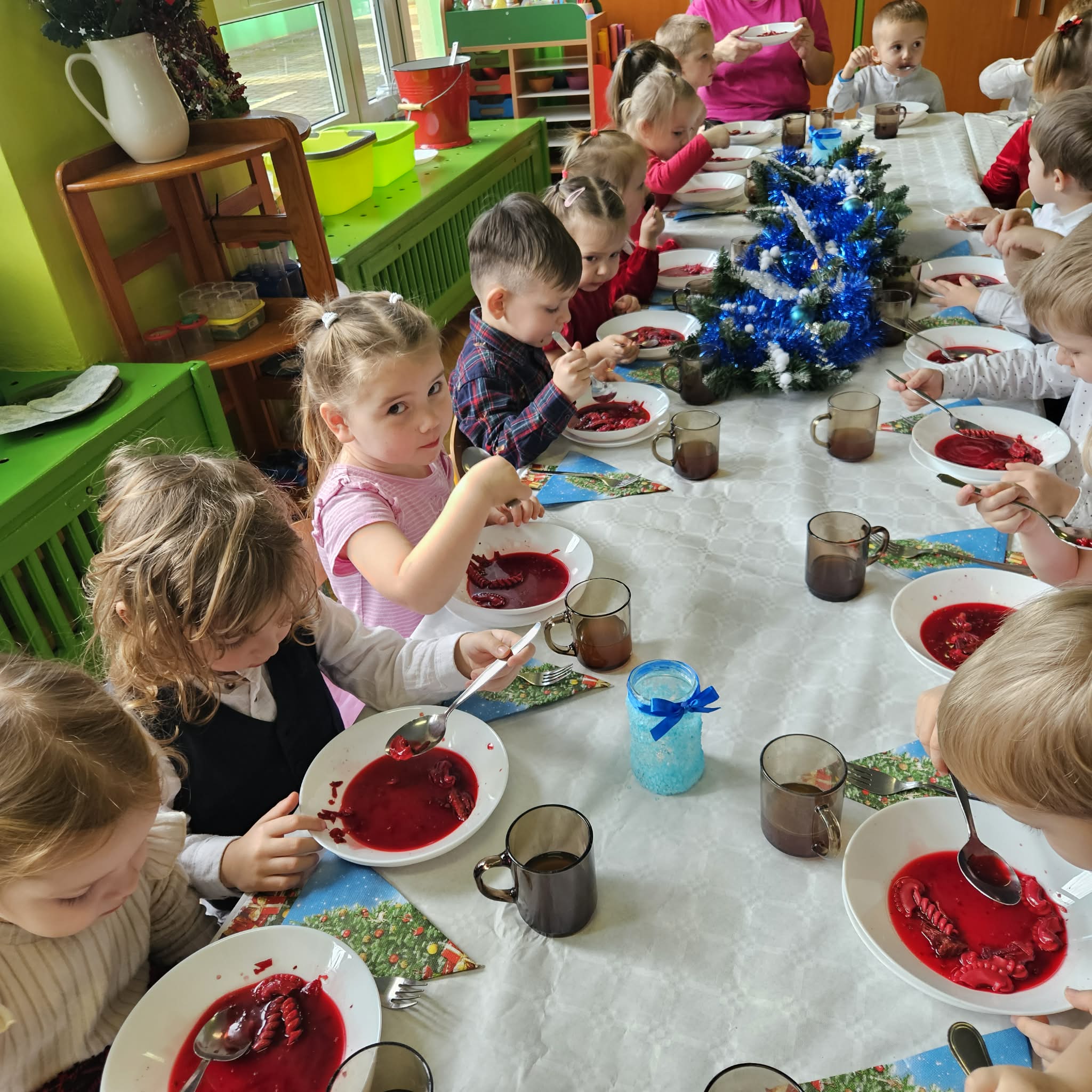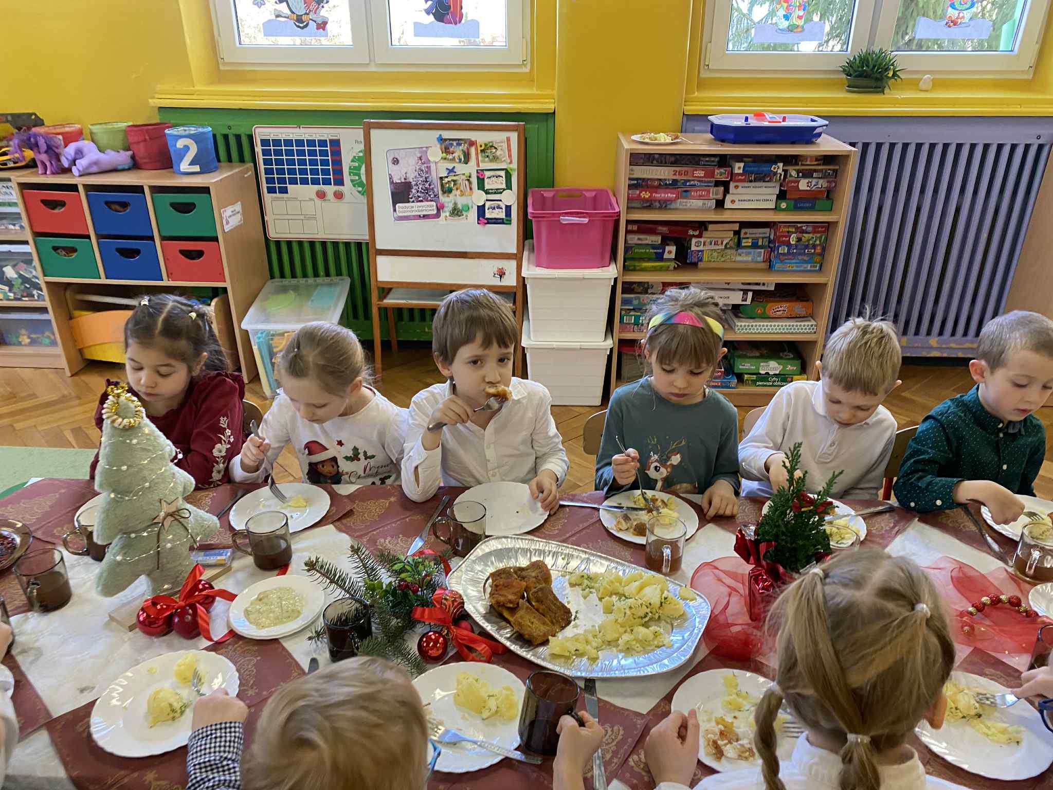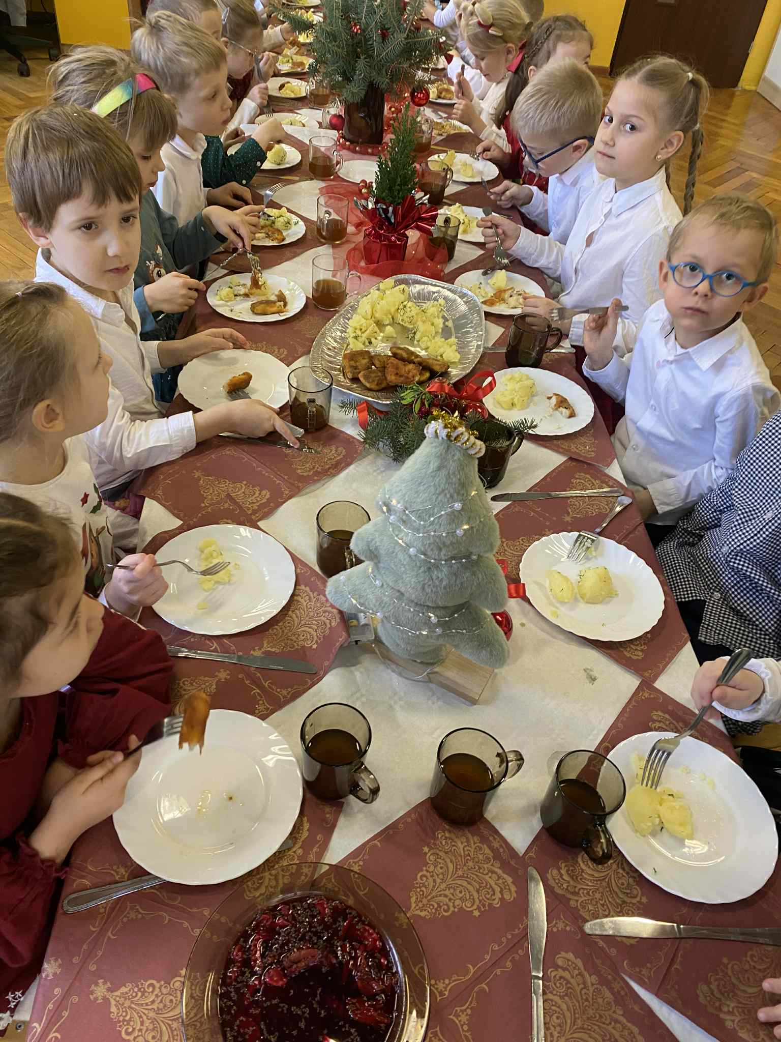 Jak co roku w świątecznej atmosferze przedszkolaki i nauczyciele zasiedli wspólnie do świątecznego obiadu. Towarzyszył nam przy tym przepięknym wystrój stołów i sal, wspólne kolędowanie oraz świąteczne potrawy.