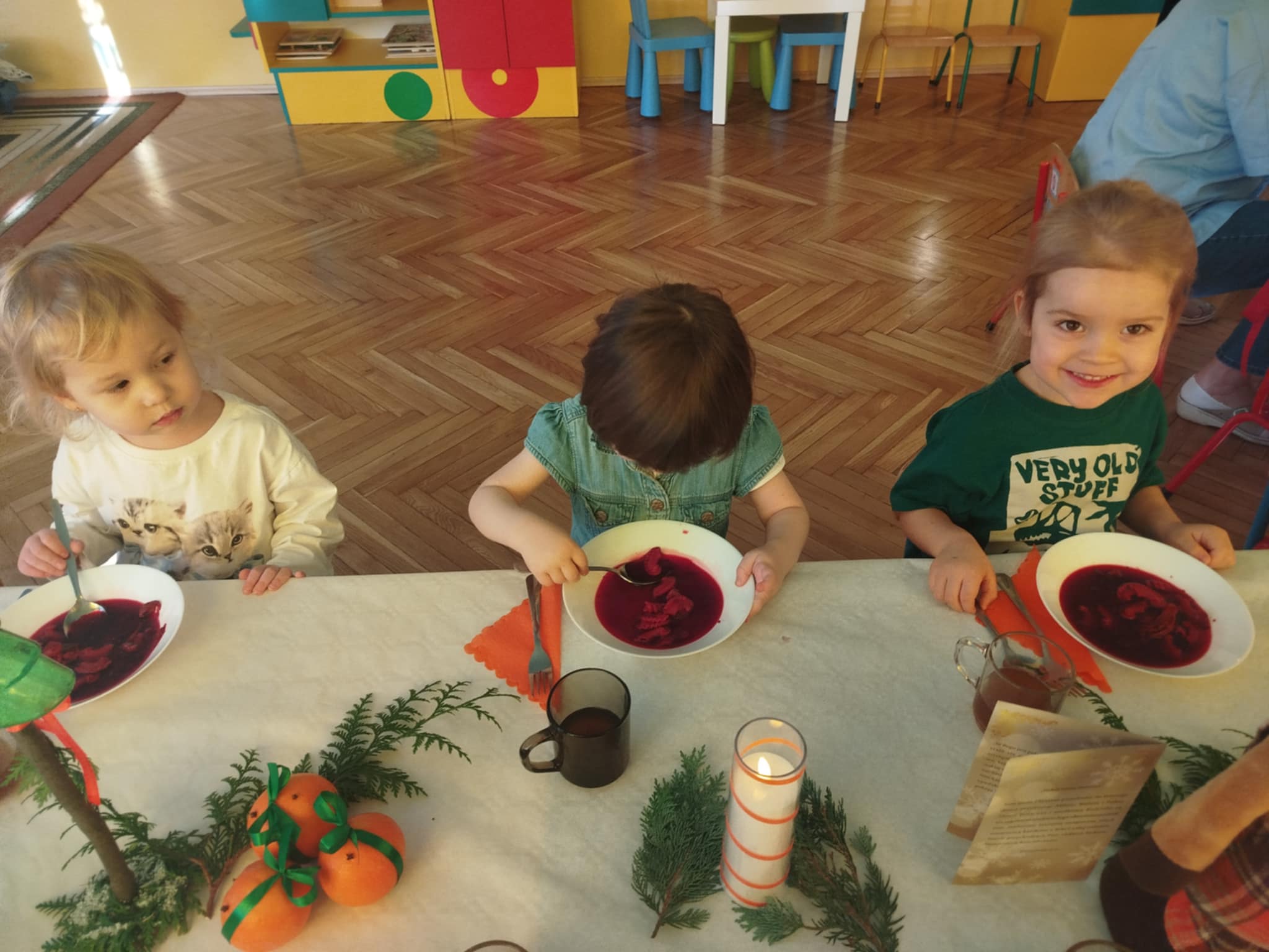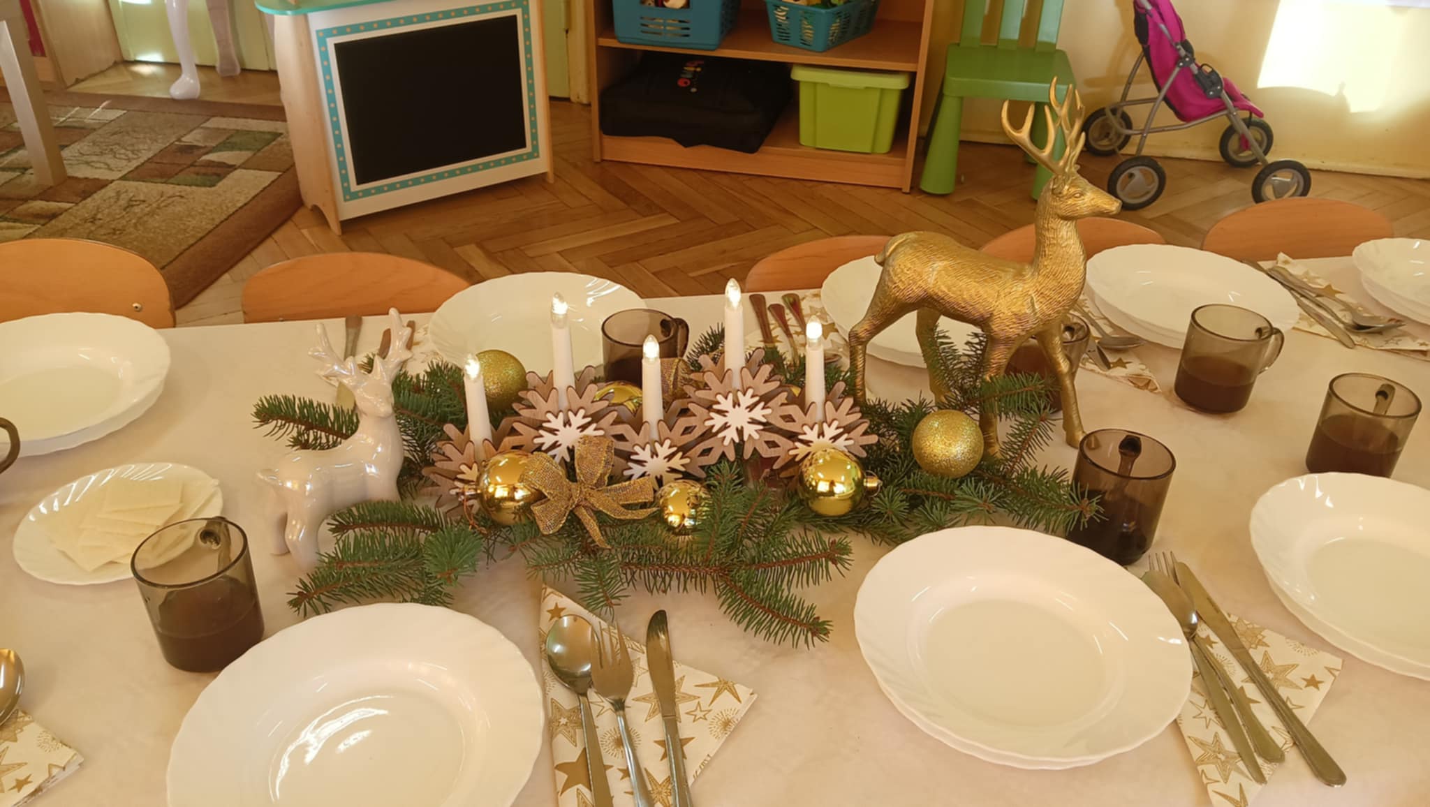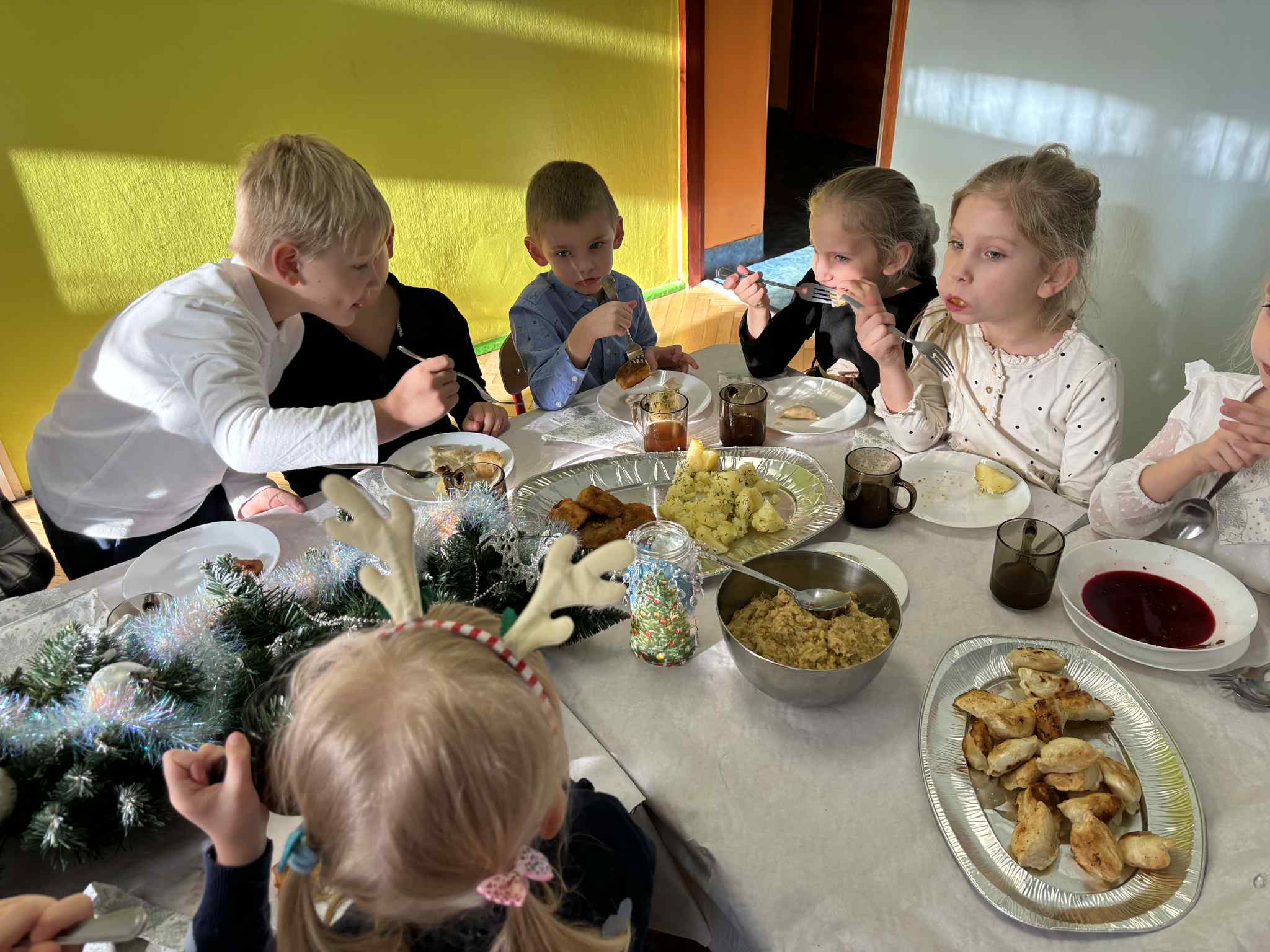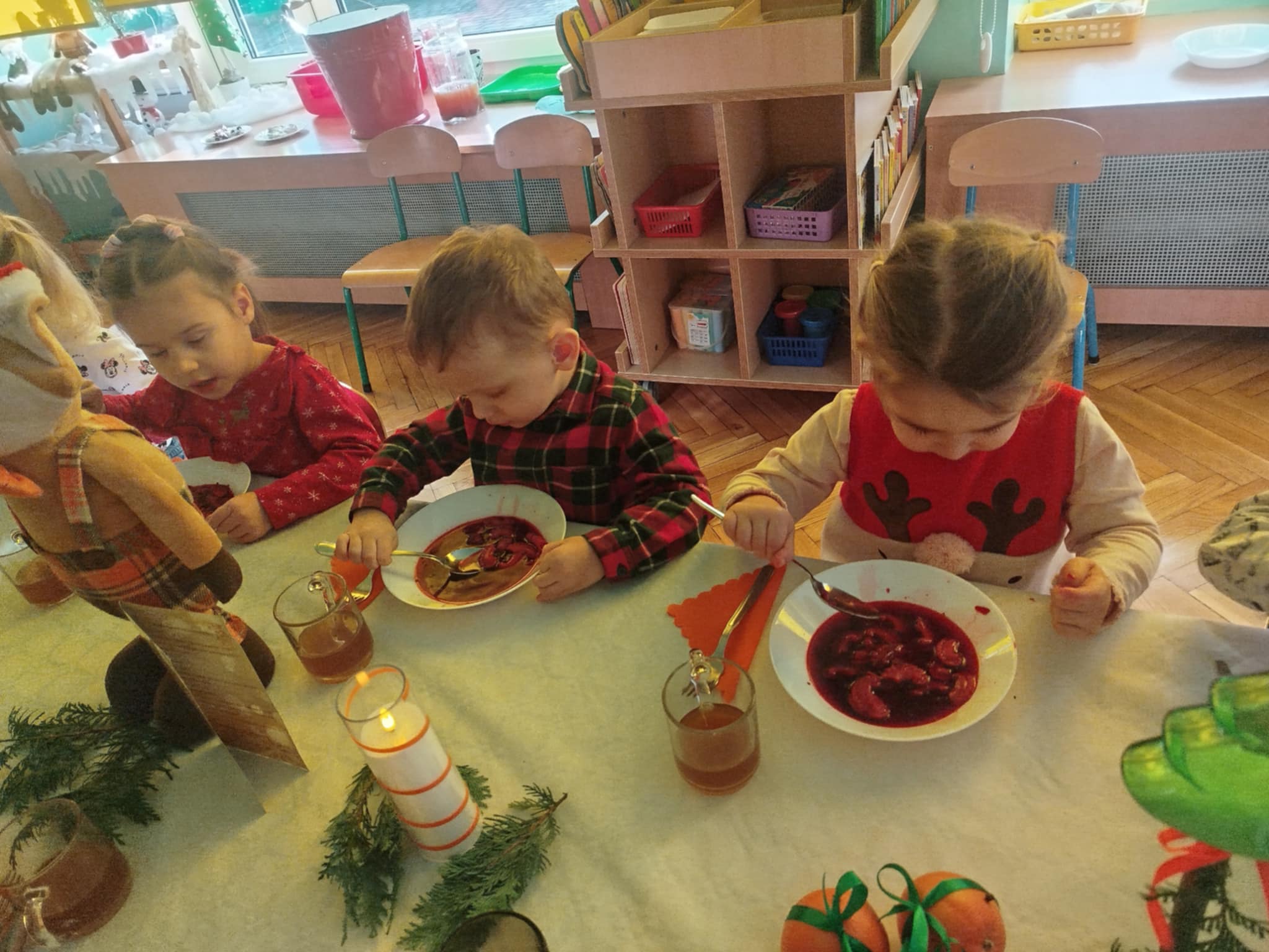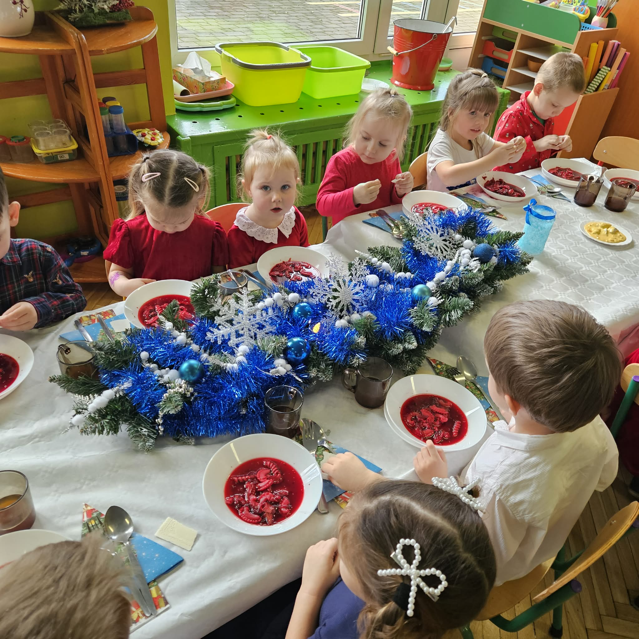 Jak co roku w świątecznej atmosferze przedszkolaki i nauczyciele zasiedli wspólnie do świątecznego obiadu. Towarzyszył nam przy tym przepięknym wystrój stołów i sal, wspólne kolędowanie oraz świąteczne potrawy.
