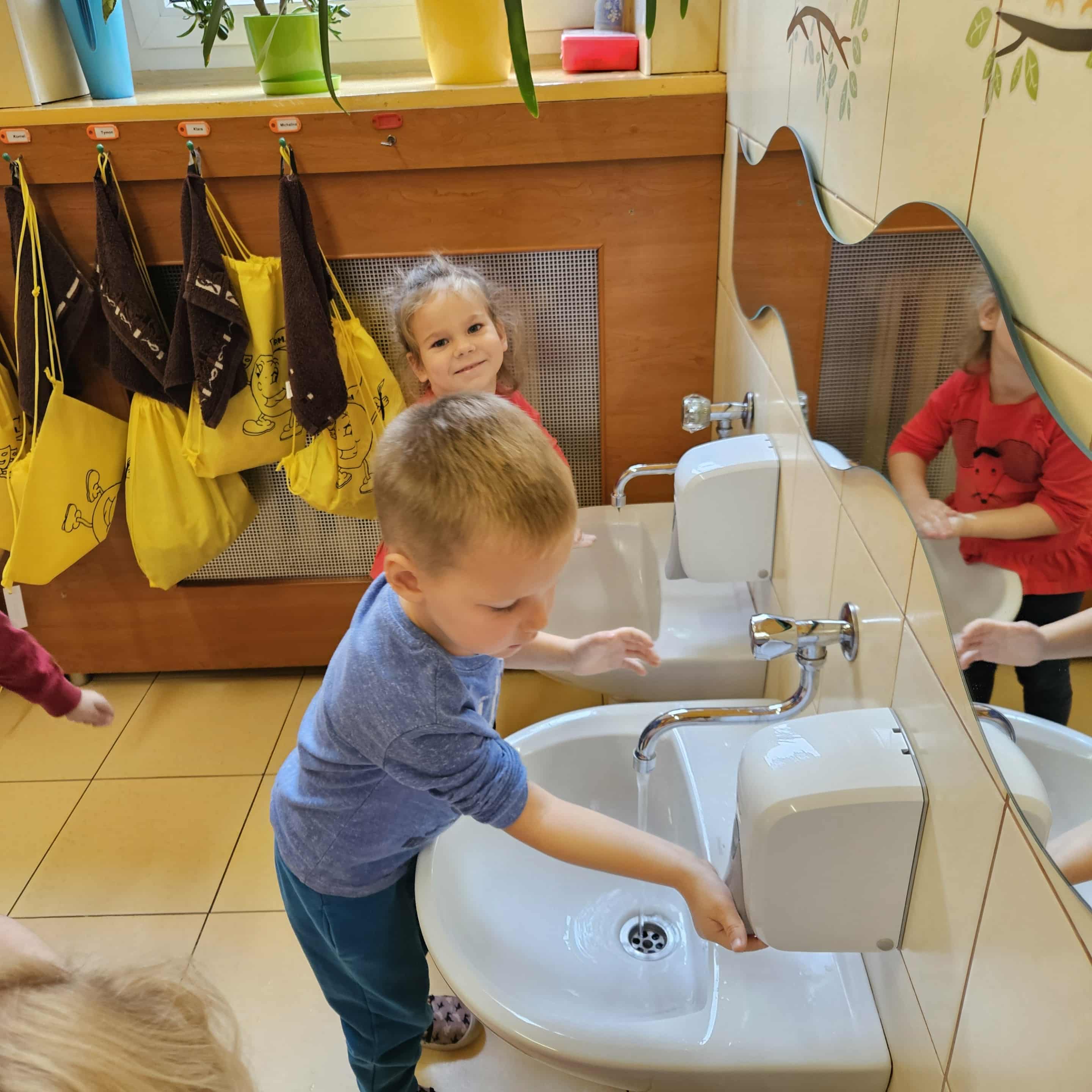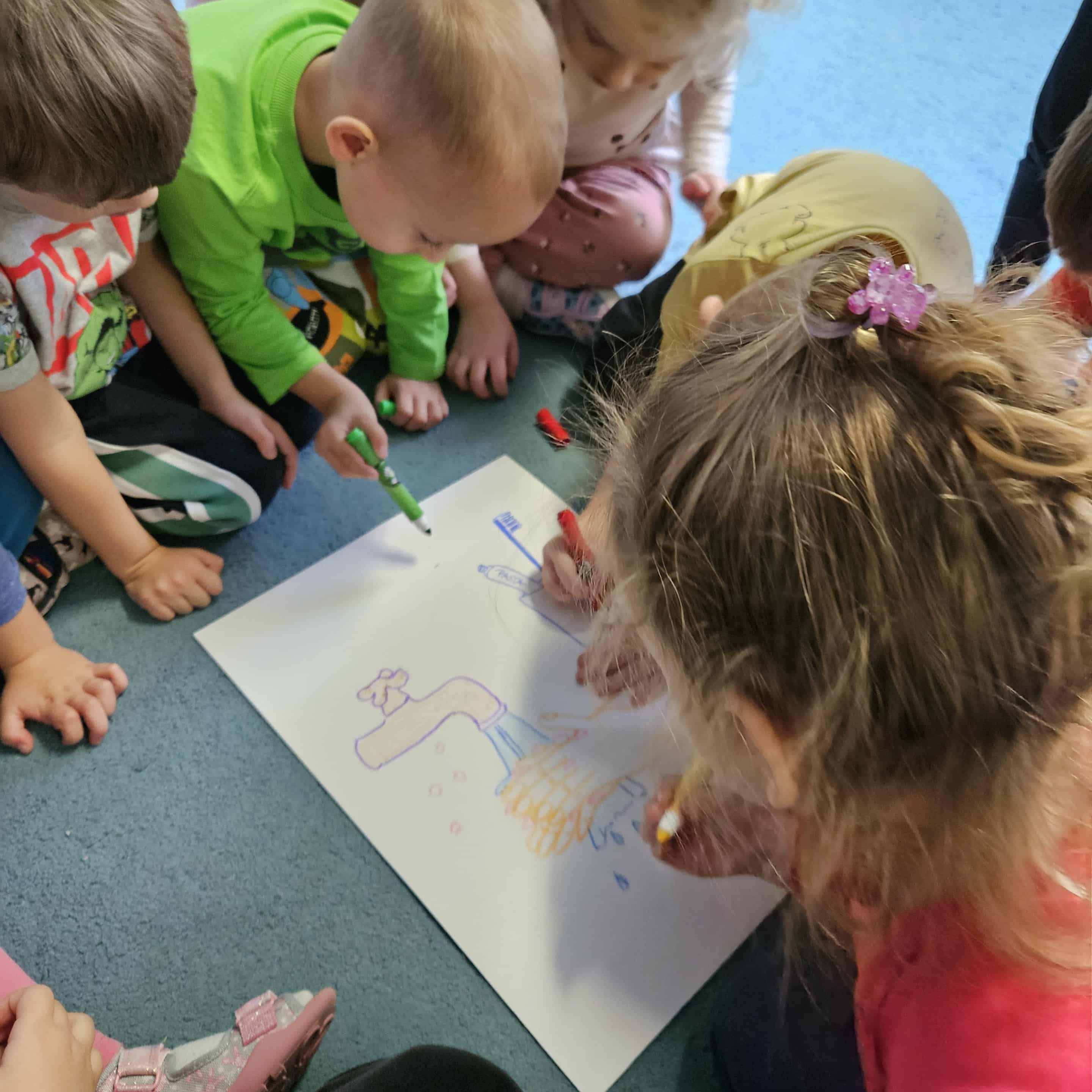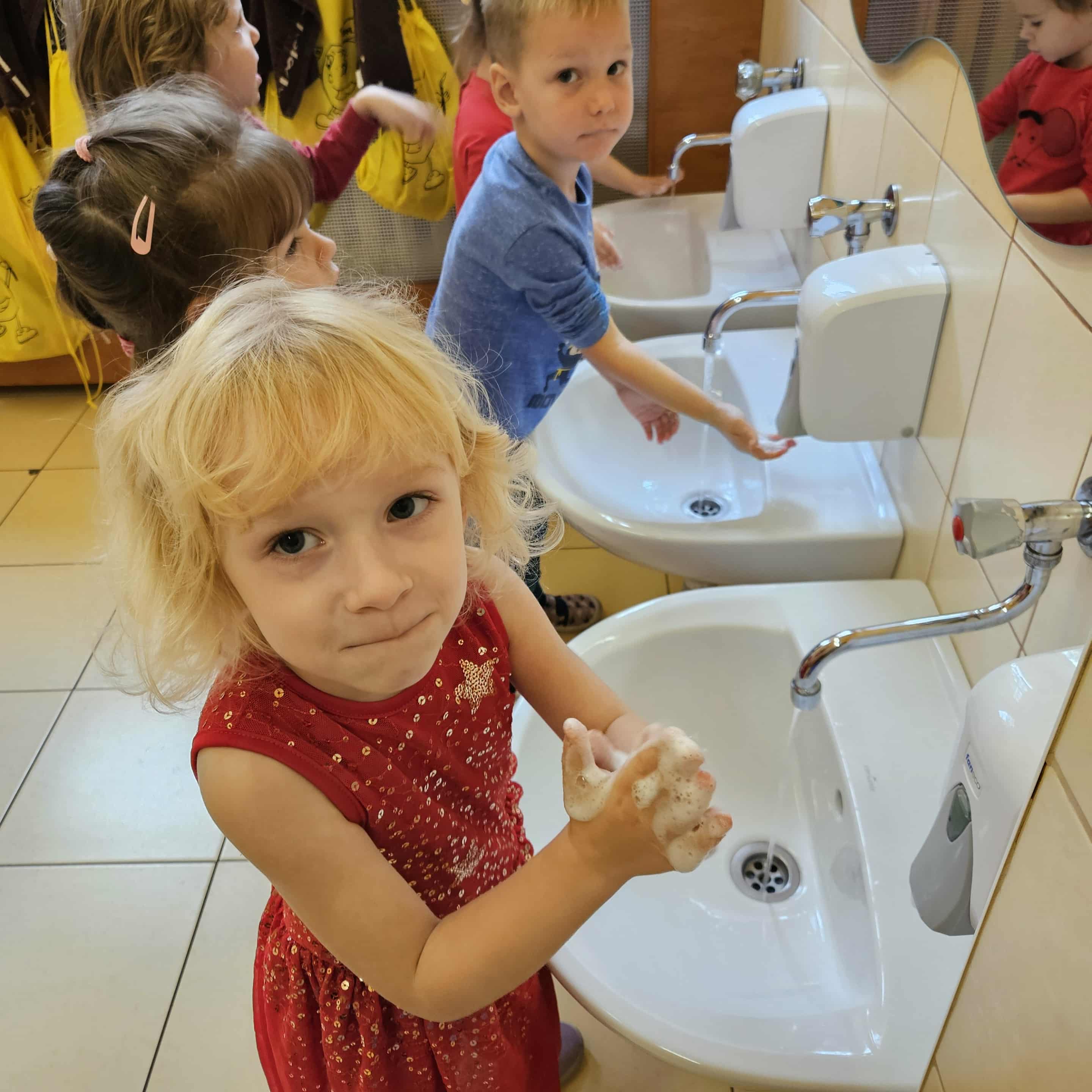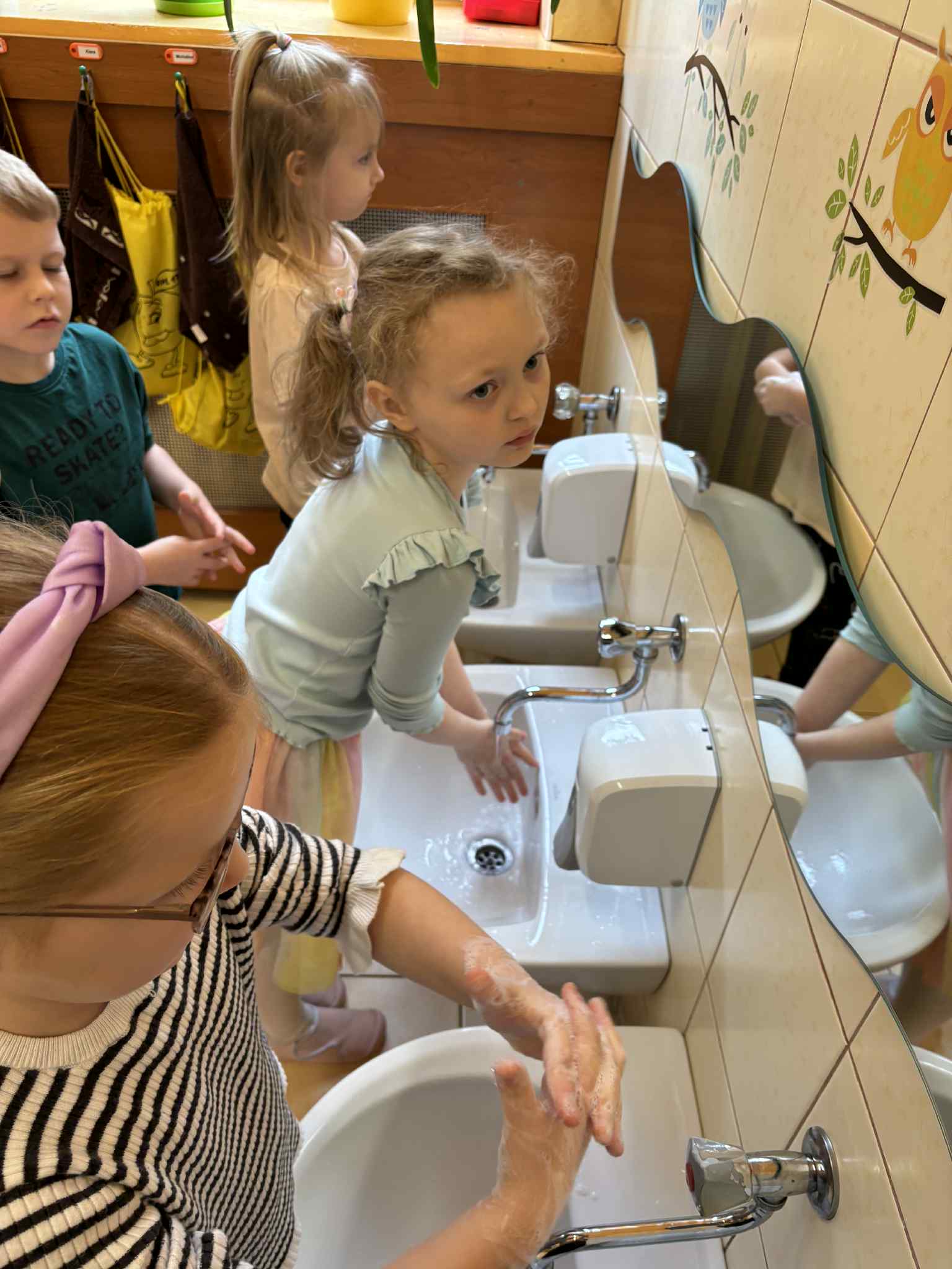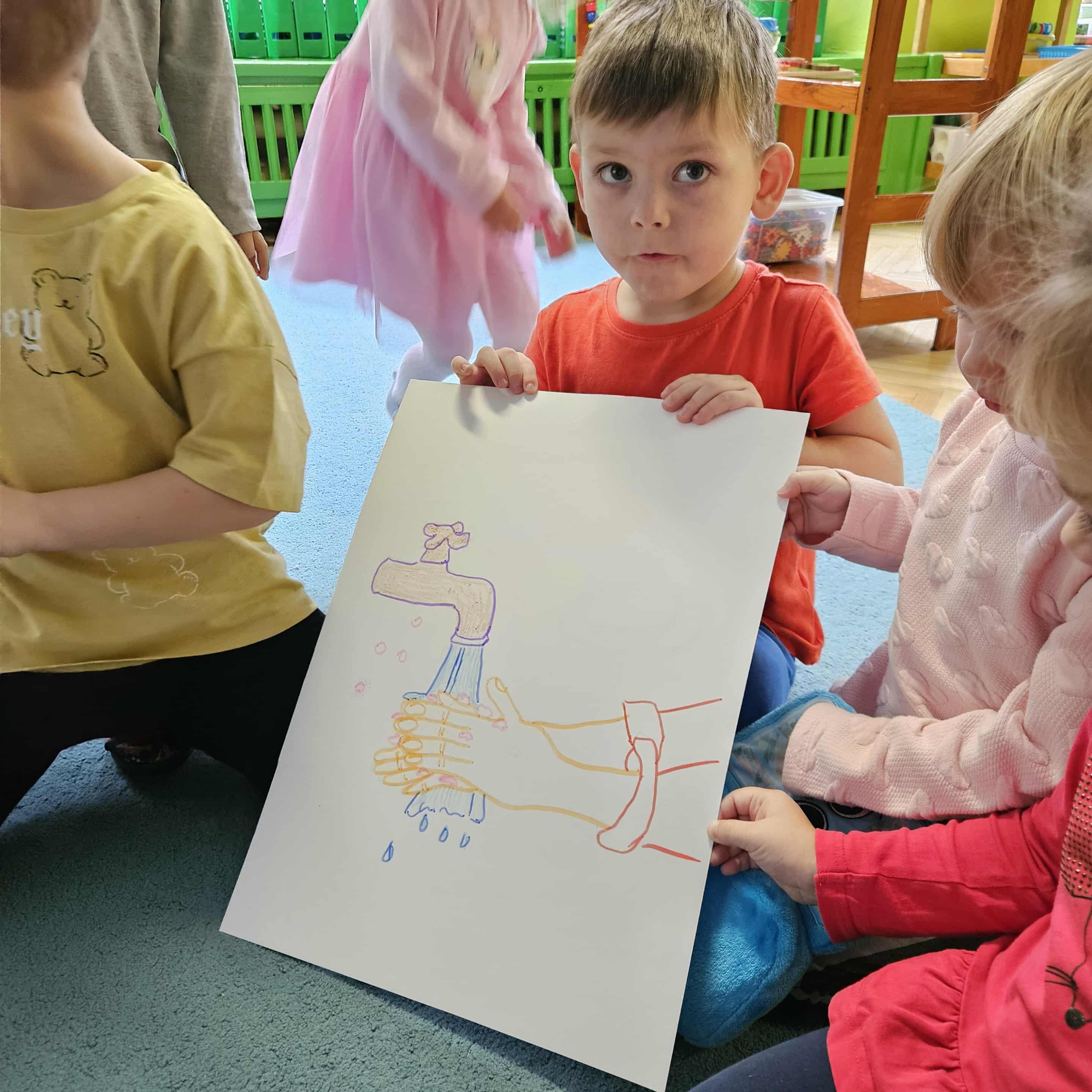 15 października obchodziliśmy w przedszkolu Światowy Dzień Mycia Rąk. Dzieci oglądały film edukacyjny „Dbamy o zdrowie”, rozwiązywały zagadki o środkach czystości, uczestniczyły w zabawach badawczych związanych ze znaczeniem czystości rąk oraz wykonywały prace plastyczne „Bakterie i wirusy”.