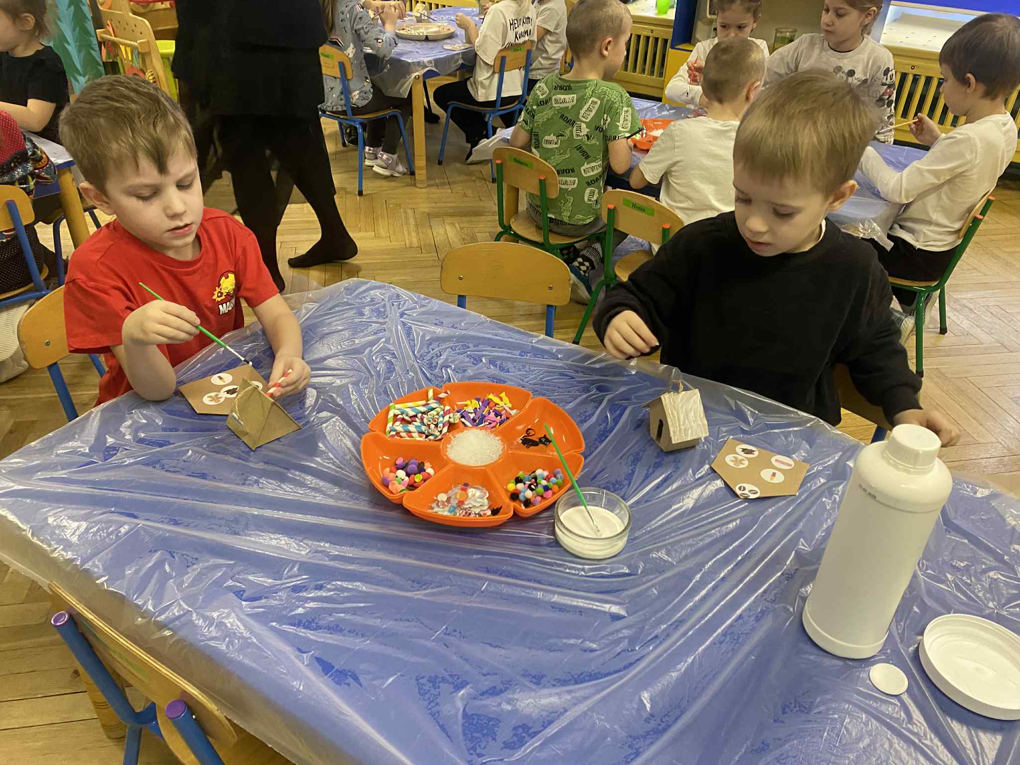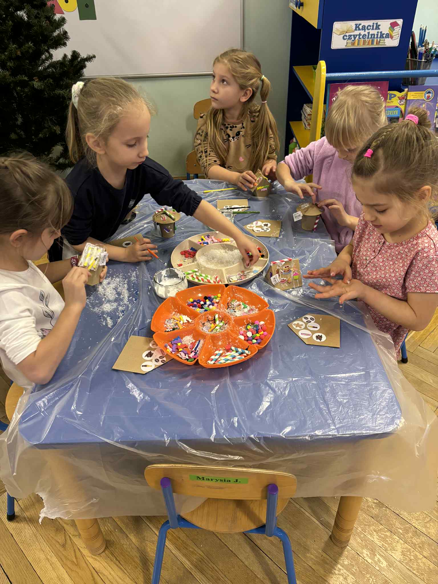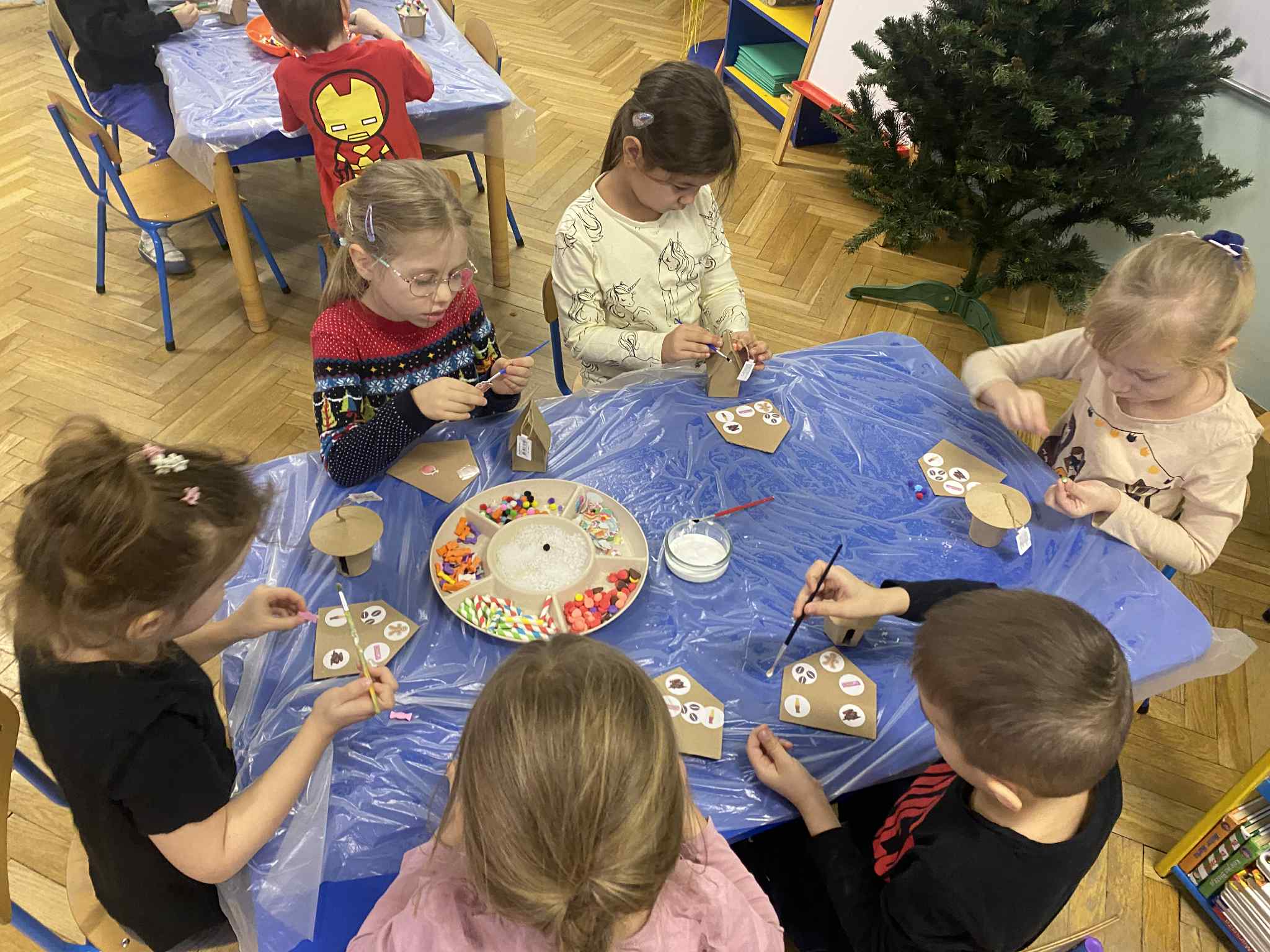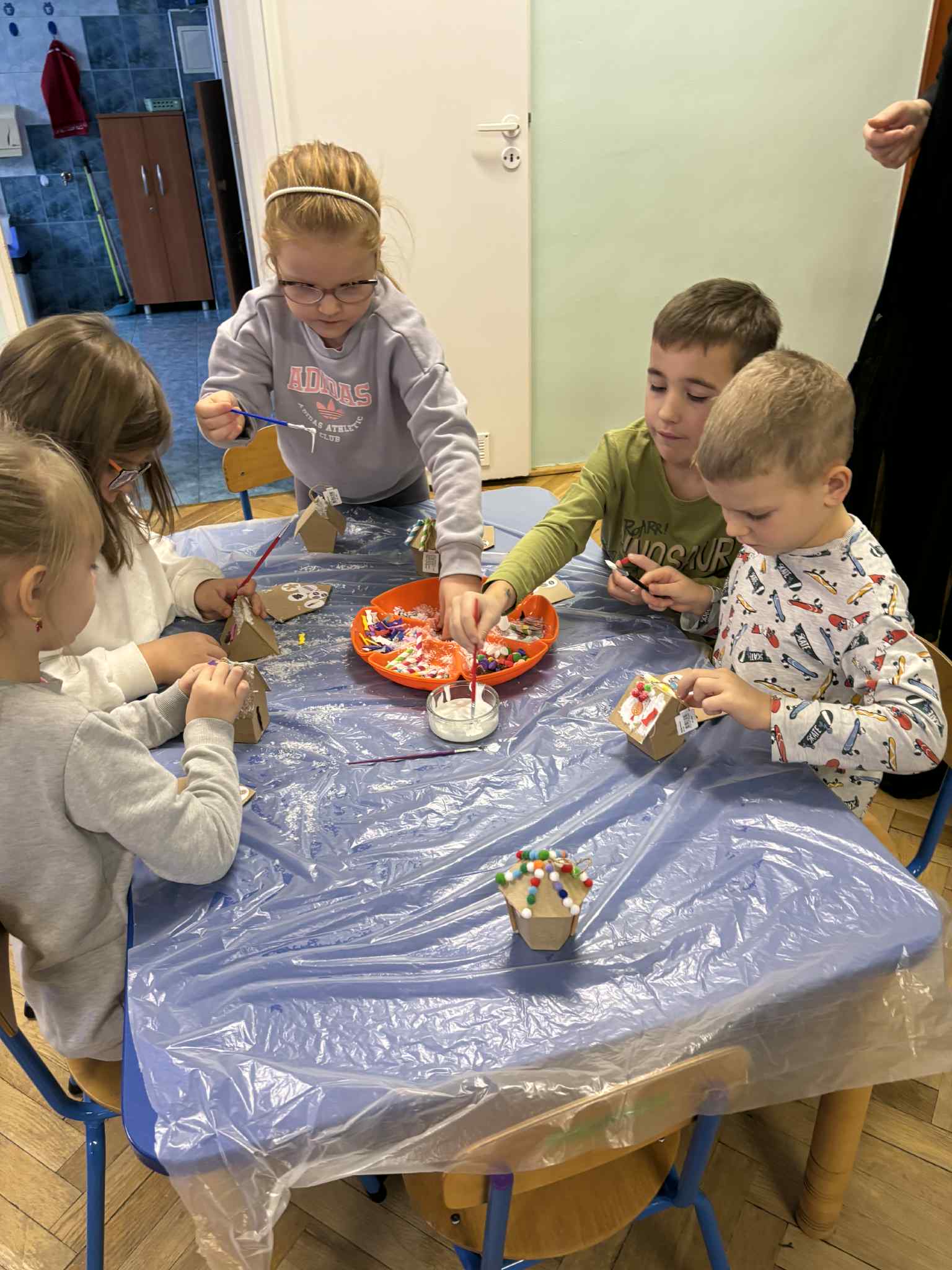 2 grudnia dzieci z grupy srebrnej i czerwonej uczestniczyły w warsztatach świątecznych, w ramach których oglądały bajkę „Jaś i Małgosia”, przechodziły po ścieżce sensorycznej wypełnionej różnorodnym materiałem przyrodniczym, celowały „siekierką w tekturowe drzewo”, rozpoznawały świąteczne zapachy zamknięte w pudełkach oraz dopasowywały klucze do odpowiednich drzwi. Elementem kończącym warsztaty było ozdobienie świątecznego domku różnymi materiałami plastycznymi. Warsztaty bardzo się wszystkim podobały , dziękujemy pani Izie za super zajęcia i duże zaangażowanie podczas ich prowadzenia.