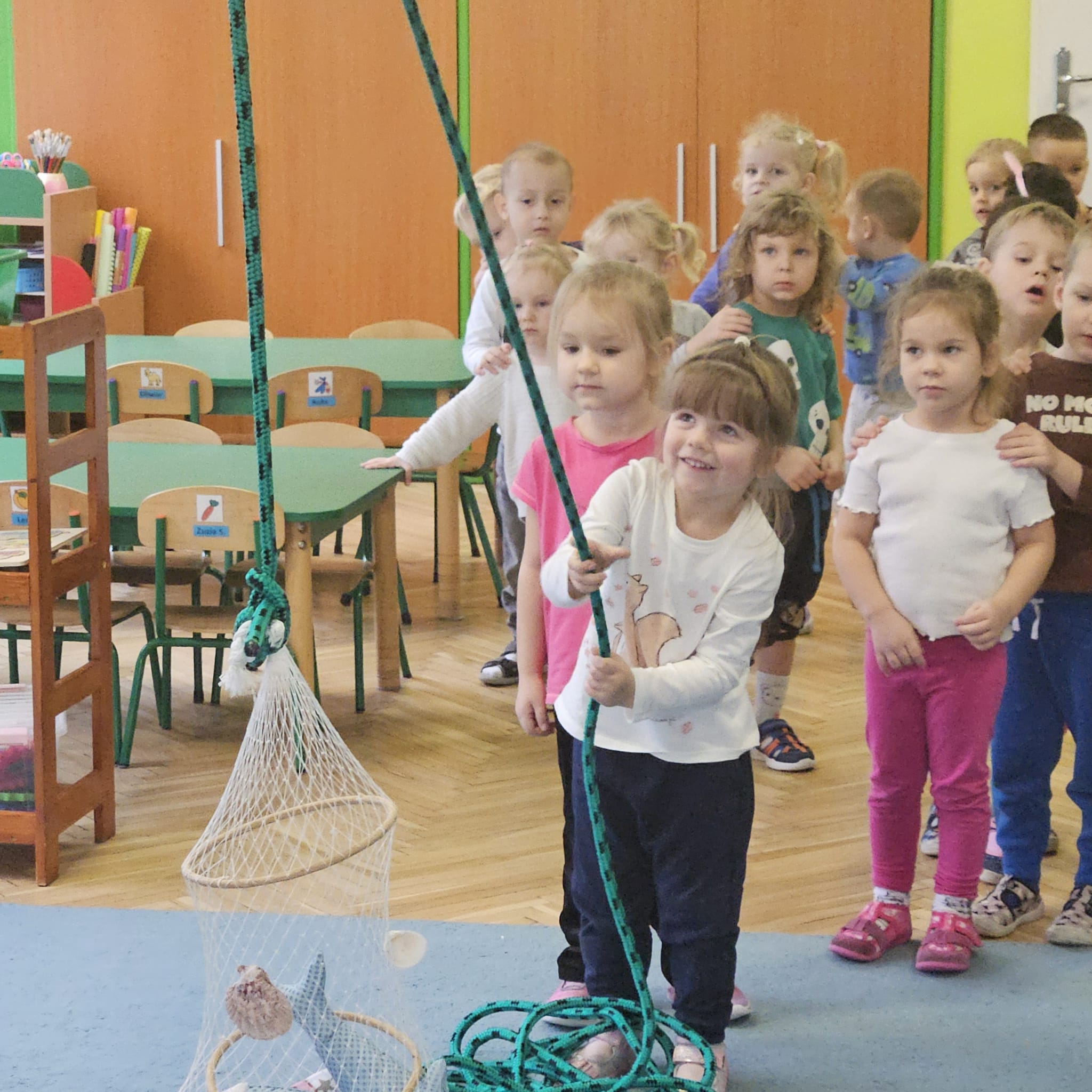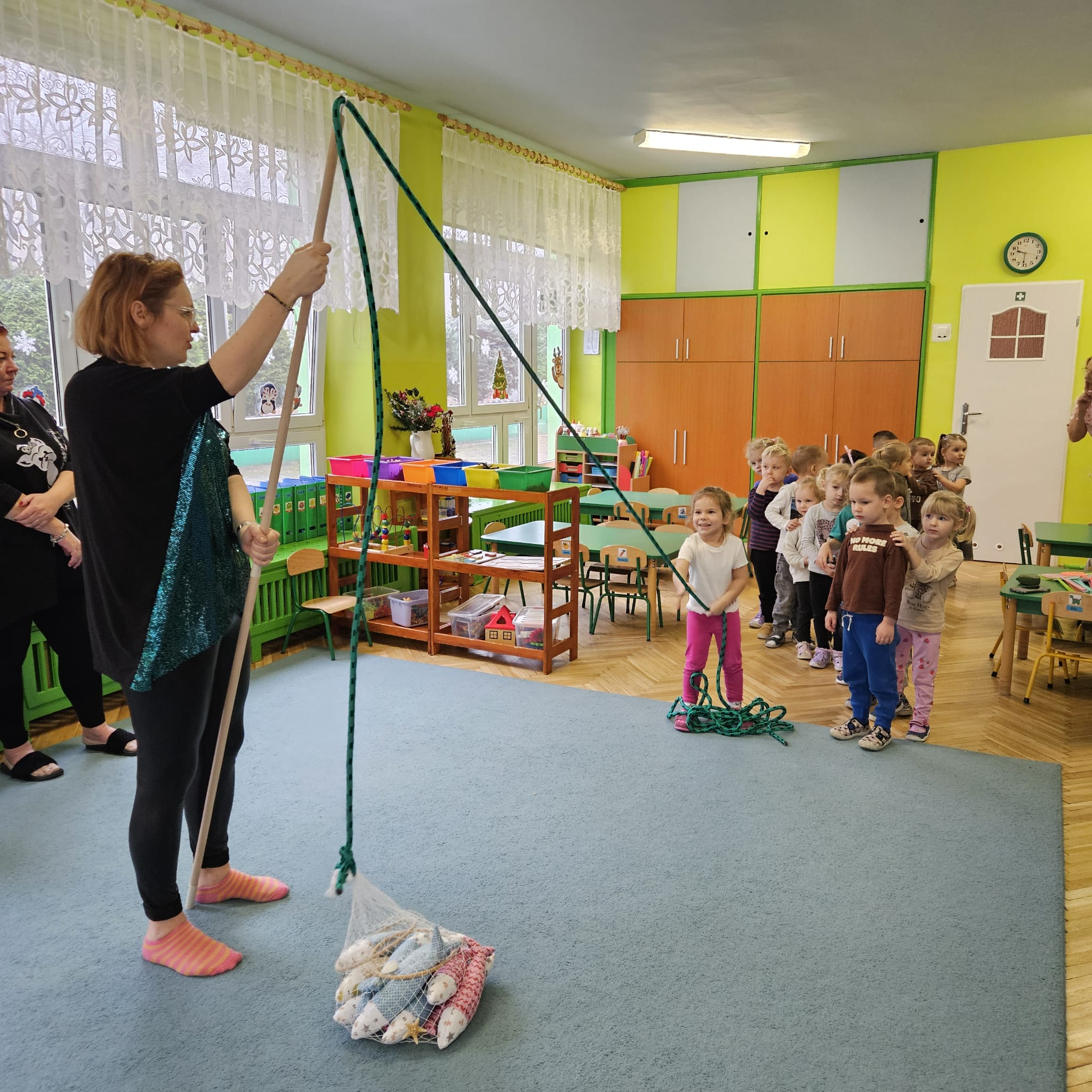 Warsztaty "O rybaku i złotej rybce" w grupie niebieskiej i pomarańczowej. Po obejrzeniu przedstawienia mogliśmy poczuć się jak prawdziwi rybacy. Wiosłowaliśmy, chodziliśmy po plaży, łowiliśmy ryby i zrobiliśmy swoją złotą rybkę.
