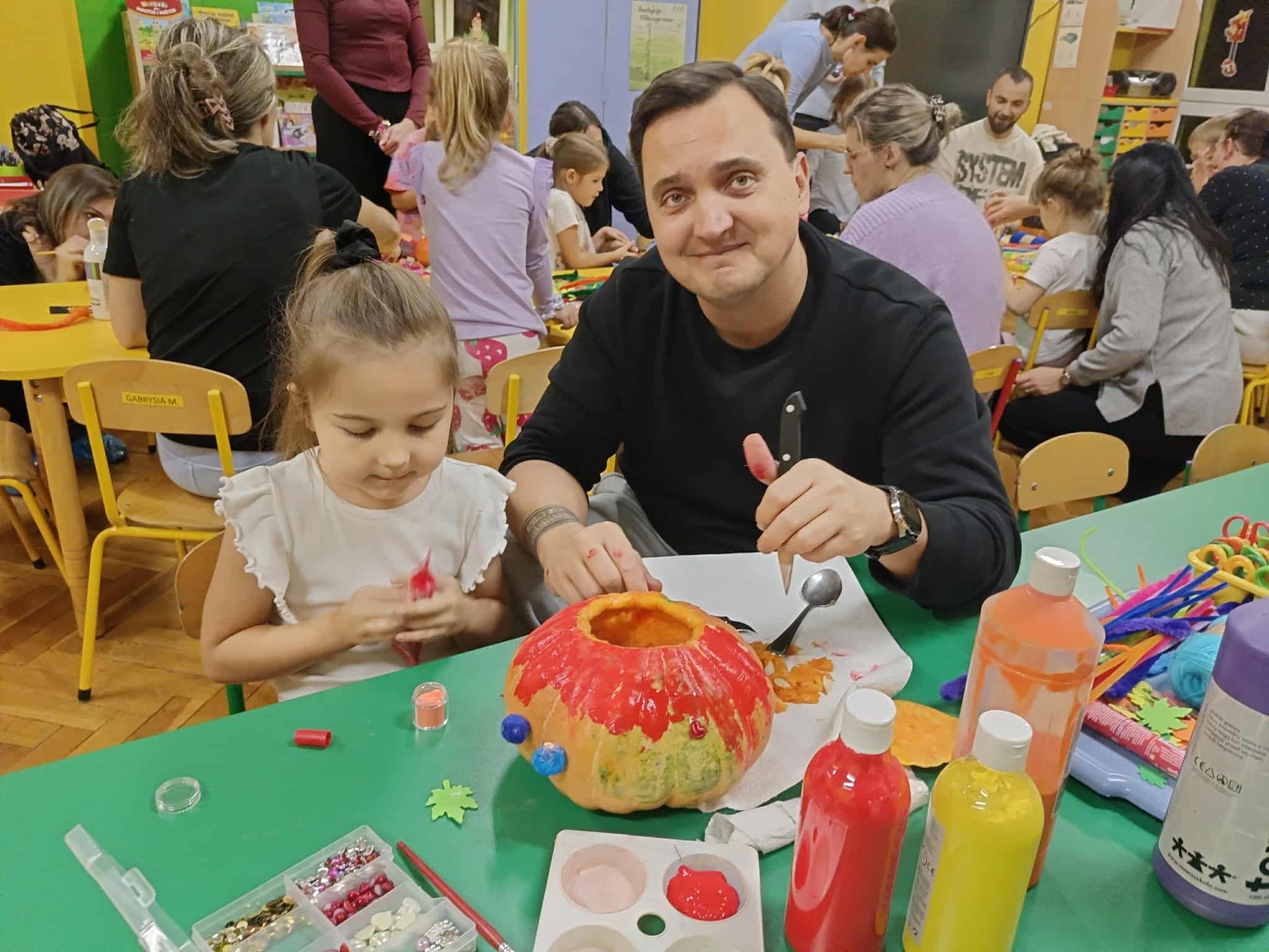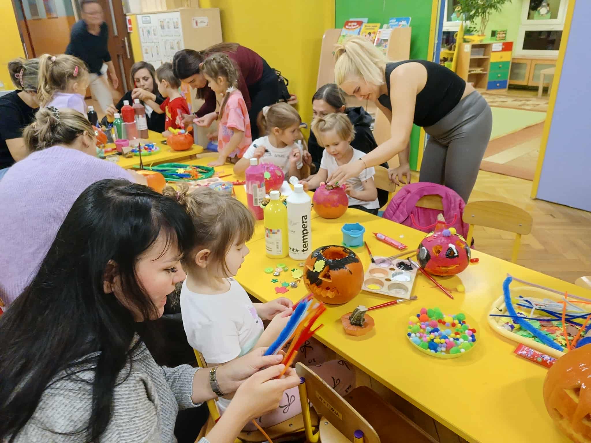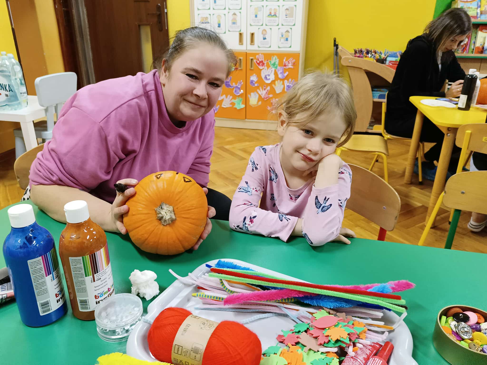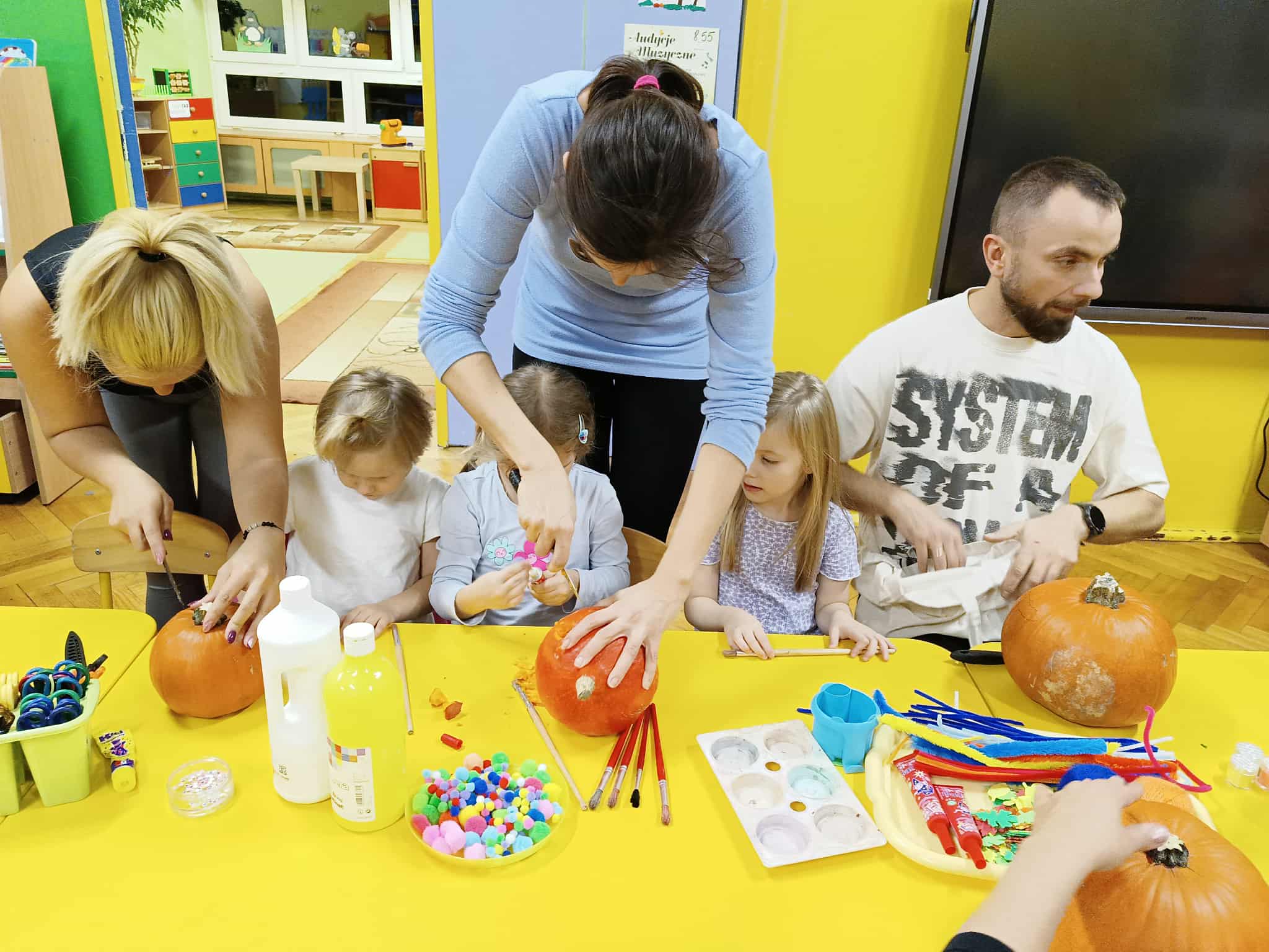 Pod koniec października w grupie żółtej odbyły się warsztaty dla rodziców. Wspólnie z dziećmi ćwiczyliśmy asany statyczne i dynamiczne, a na koniec za aktywny udział rodziców w zajęciach, w nagrodę dzieci wykonały masaż - turlając się po rodzicach. Wspólnie świetnie się bawiliśmy! Zwieńczeniem warsztatów było ozdabianie dyń, z okazji Święta Dyni. Dziękujemy za wspólnie spędzony czas.