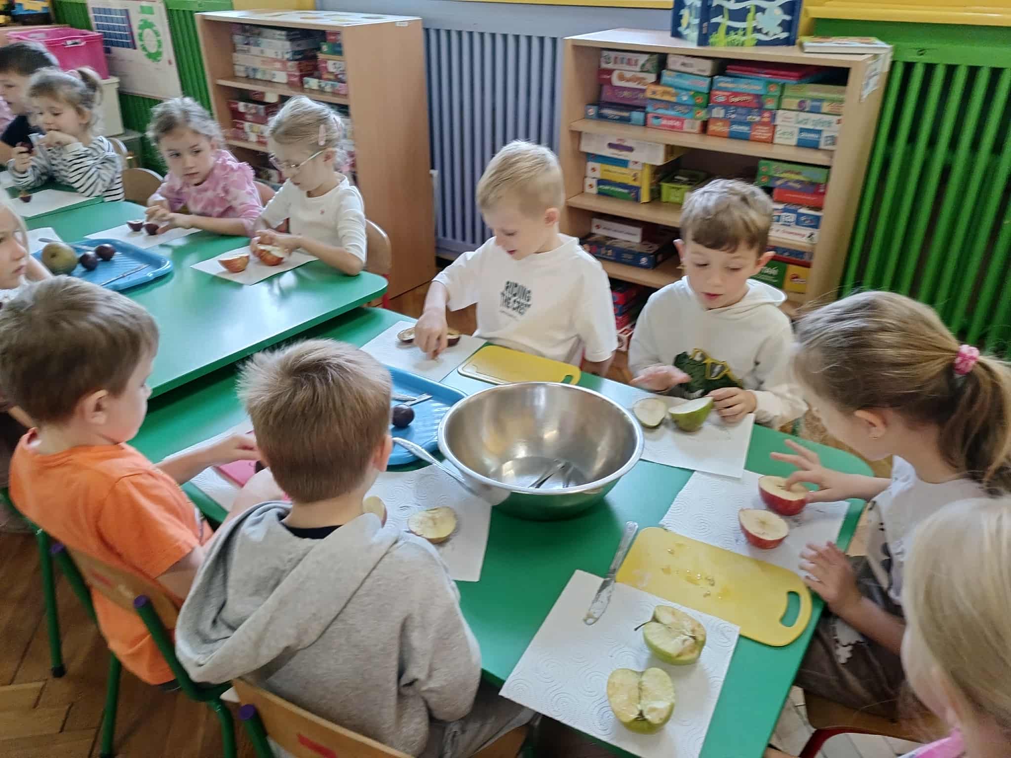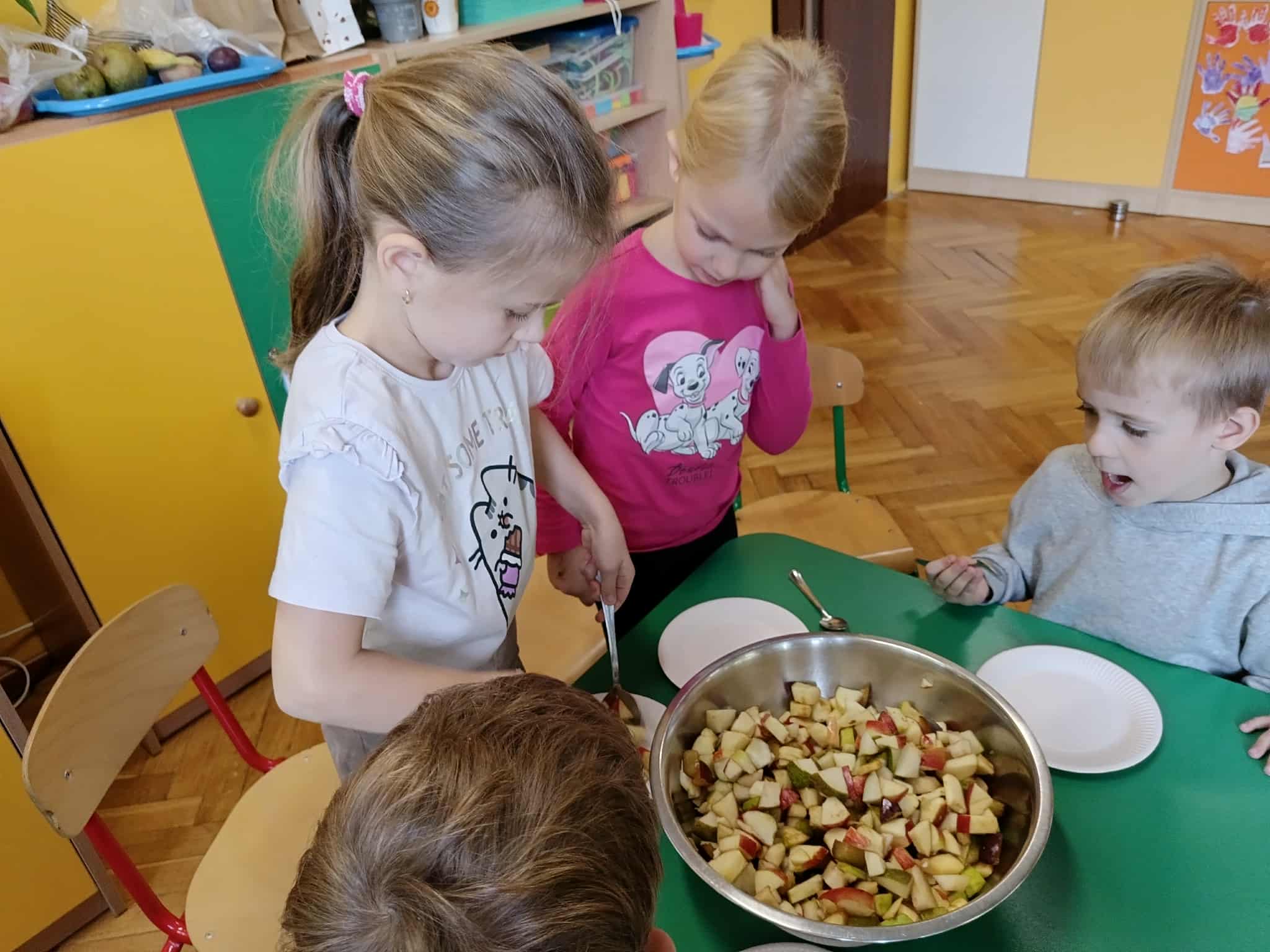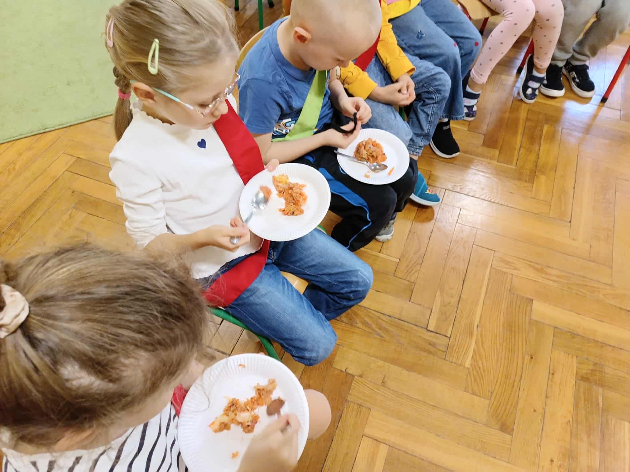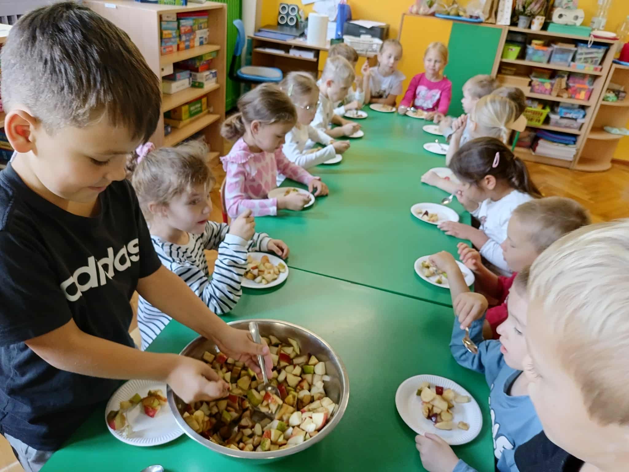 W tym tygodniu grupa czerwona zamieniła się w kucharzy. Dzieci zapoznały się z piramidą zdrowego żywienia oraz doskonaliły swoje umiejętności w przetwórstwie warzywno-owocowym. Wyszło zdrowo, smacznie i kolorowo!