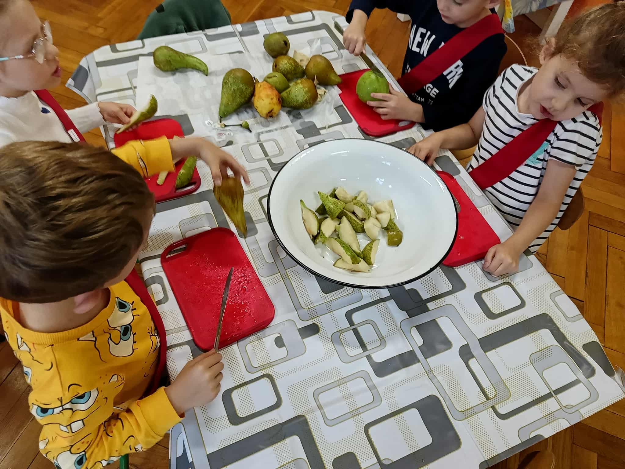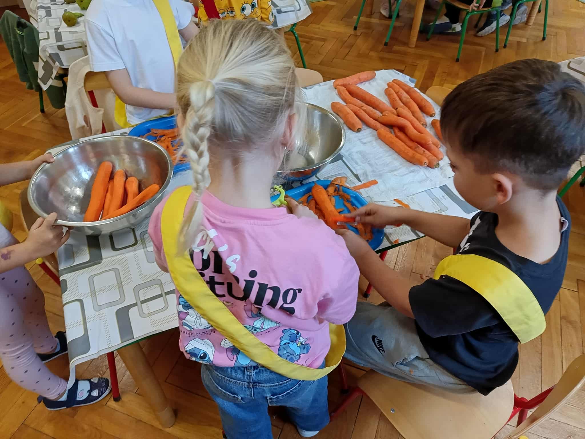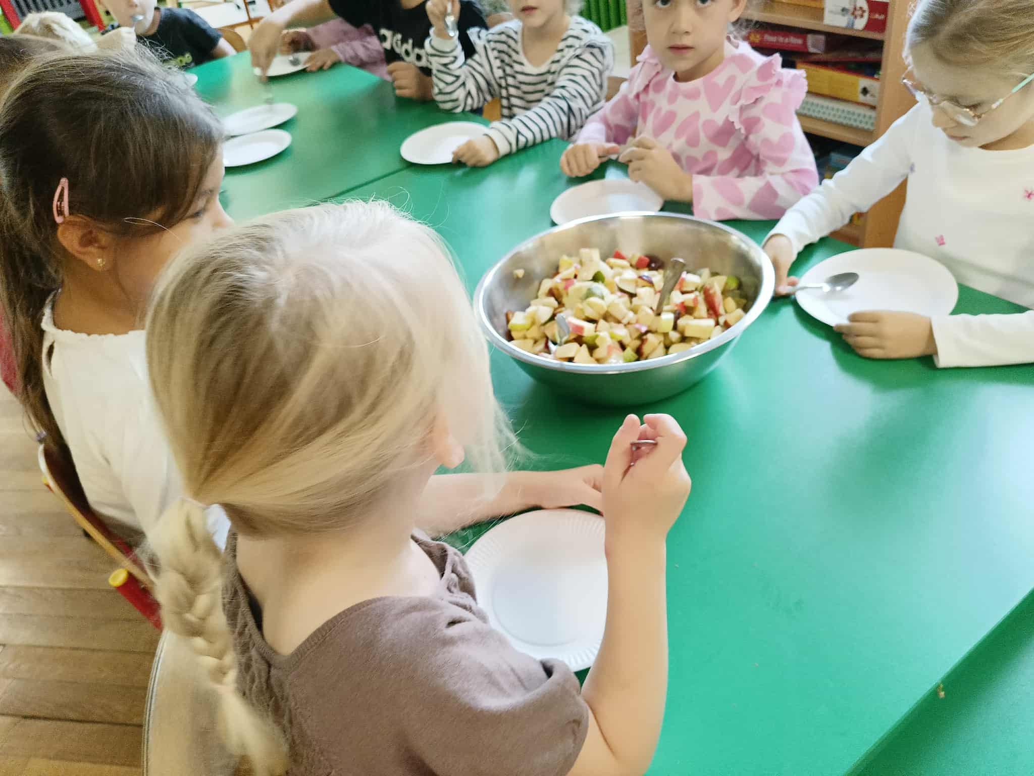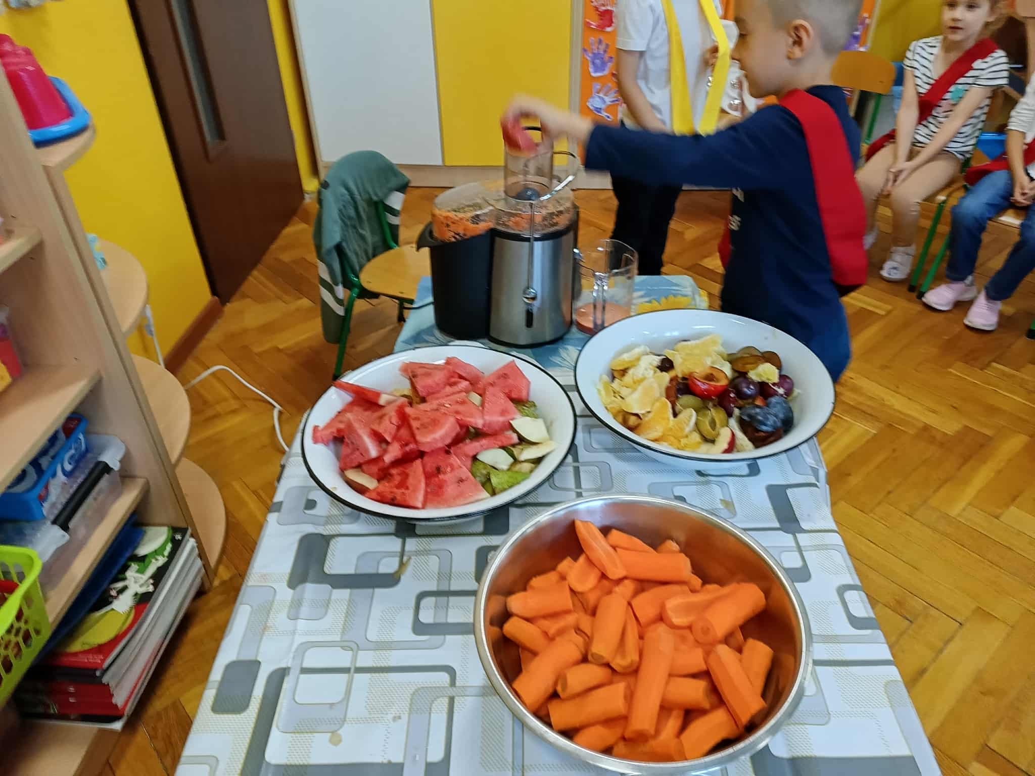 W tym tygodniu grupa czerwona zamieniła się w kucharzy. Dzieci zapoznały się z piramidą zdrowego żywienia oraz doskonaliły swoje umiejętności w przetwórstwie warzywno-owocowym. Wyszło zdrowo, smacznie i kolorowo!