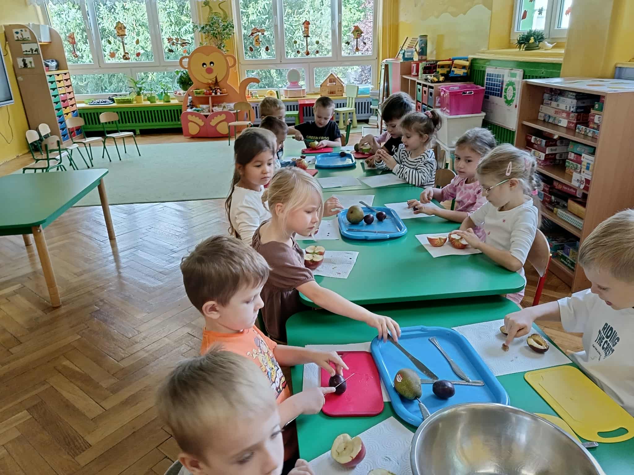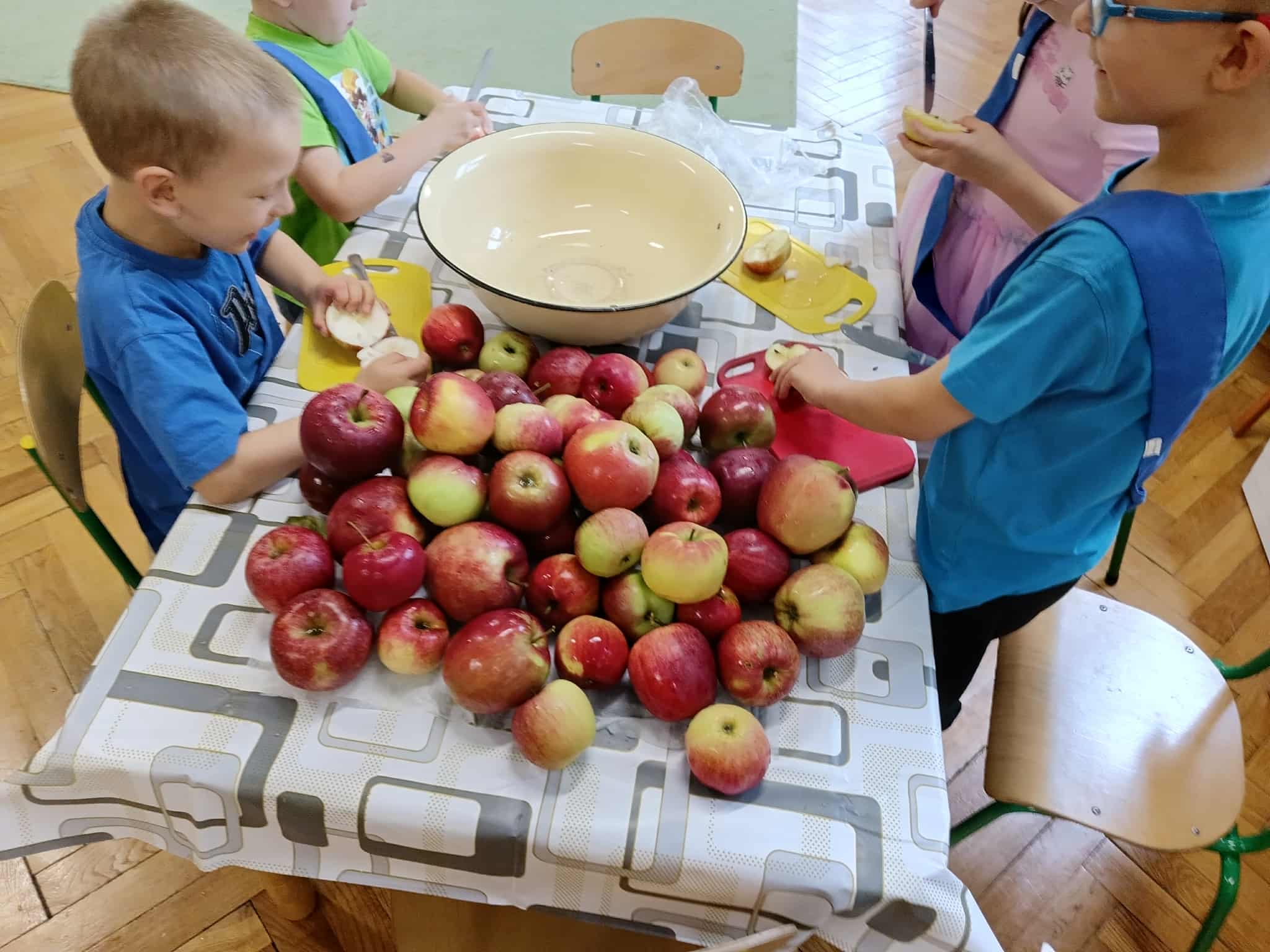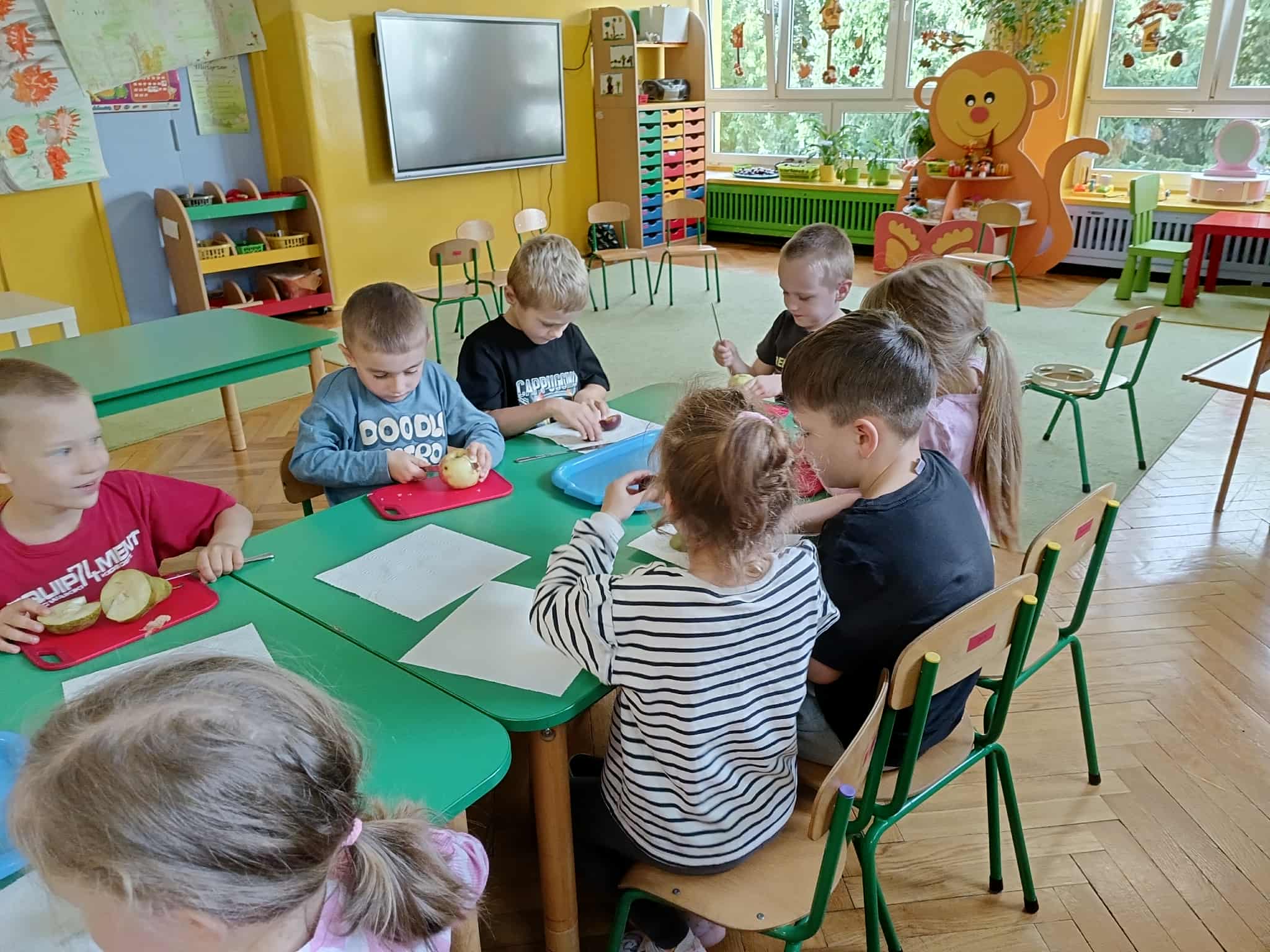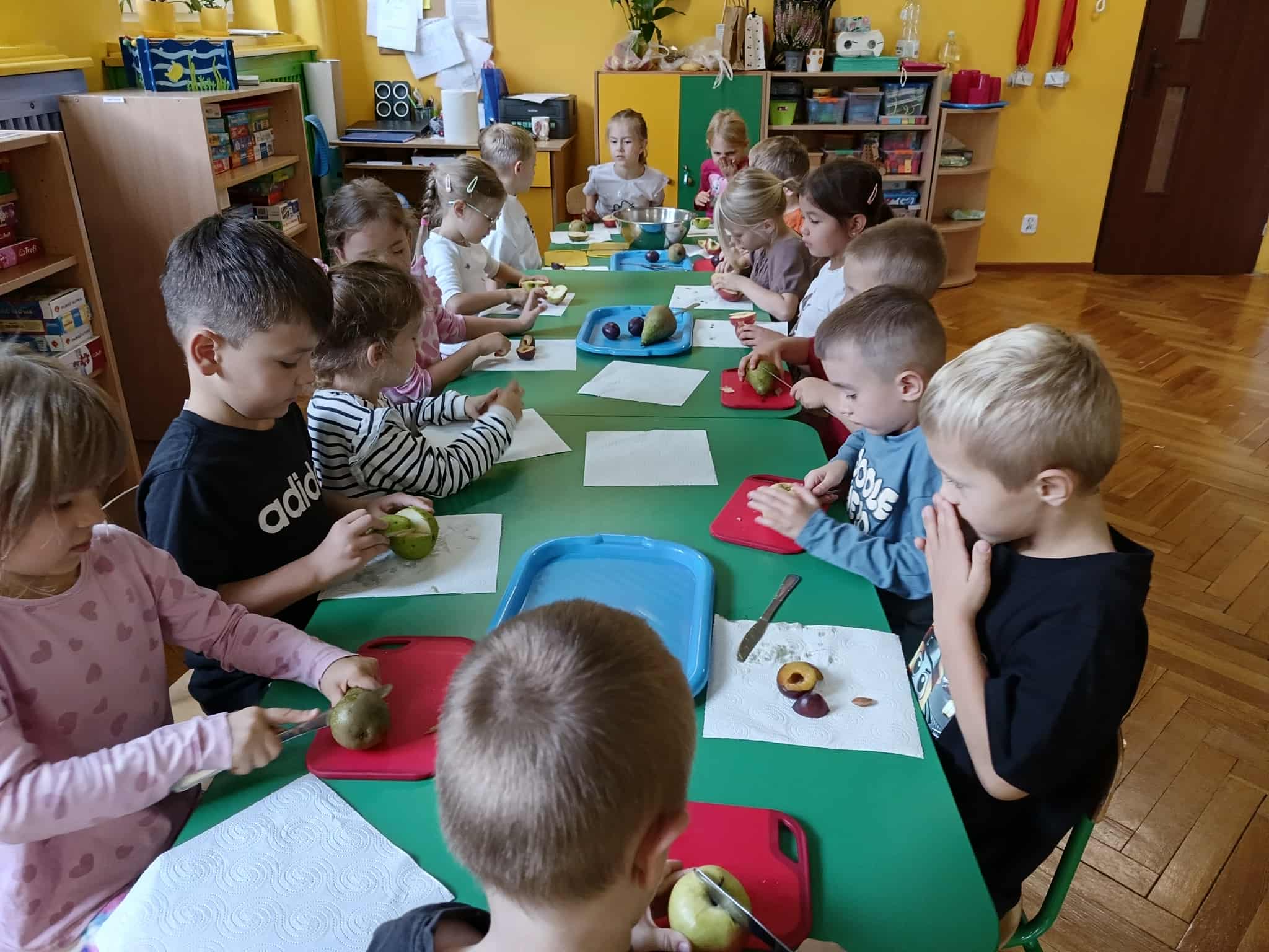 W tym tygodniu grupa czerwona zamieniła się w kucharzy. Dzieci zapoznały się z piramidą zdrowego żywienia oraz doskonaliły swoje umiejętności w przetwórstwie warzywno-owocowym. Wyszło zdrowo, smacznie i kolorowo!