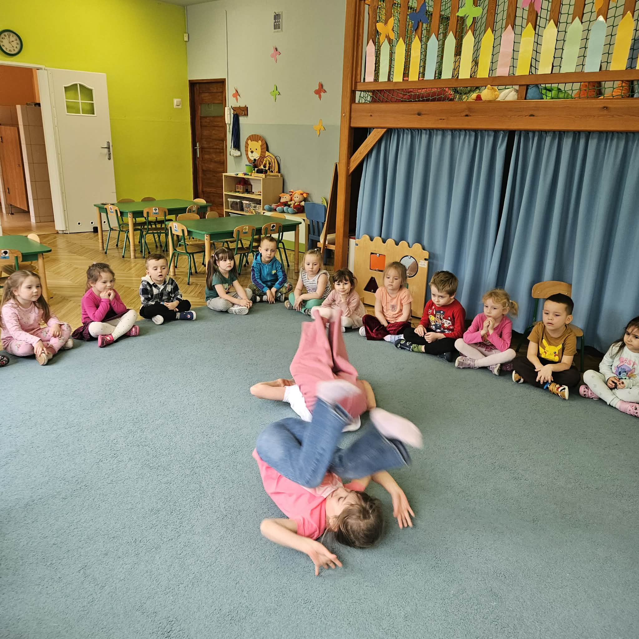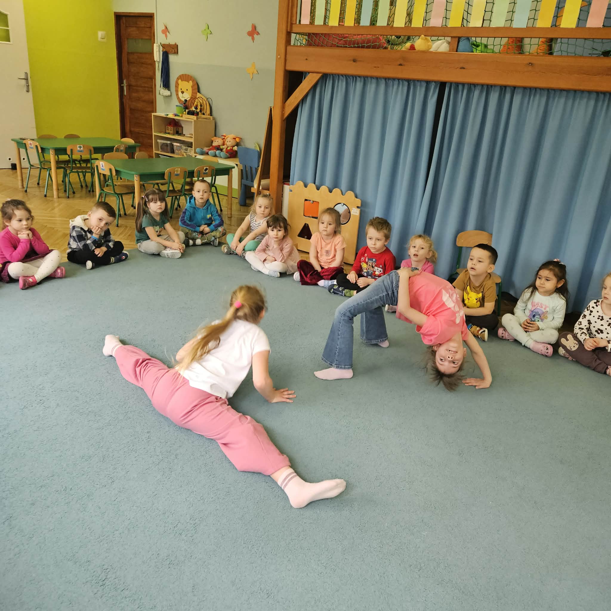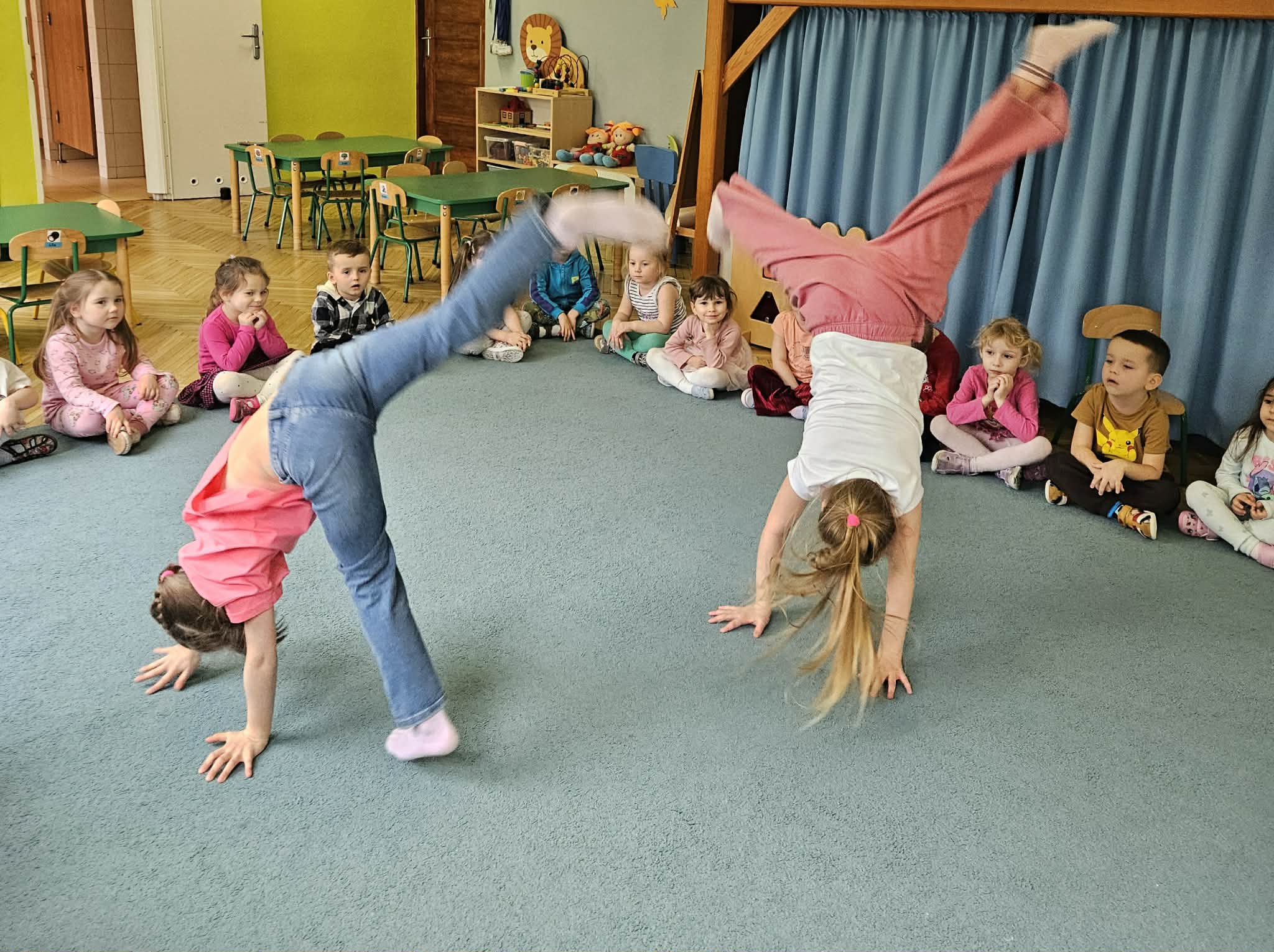 Pokaz tańca z elementami akrobatyki w grupie niebieskiej. Dziękujemy Tosi i Hani z grupy srebrnej za piękny występ.